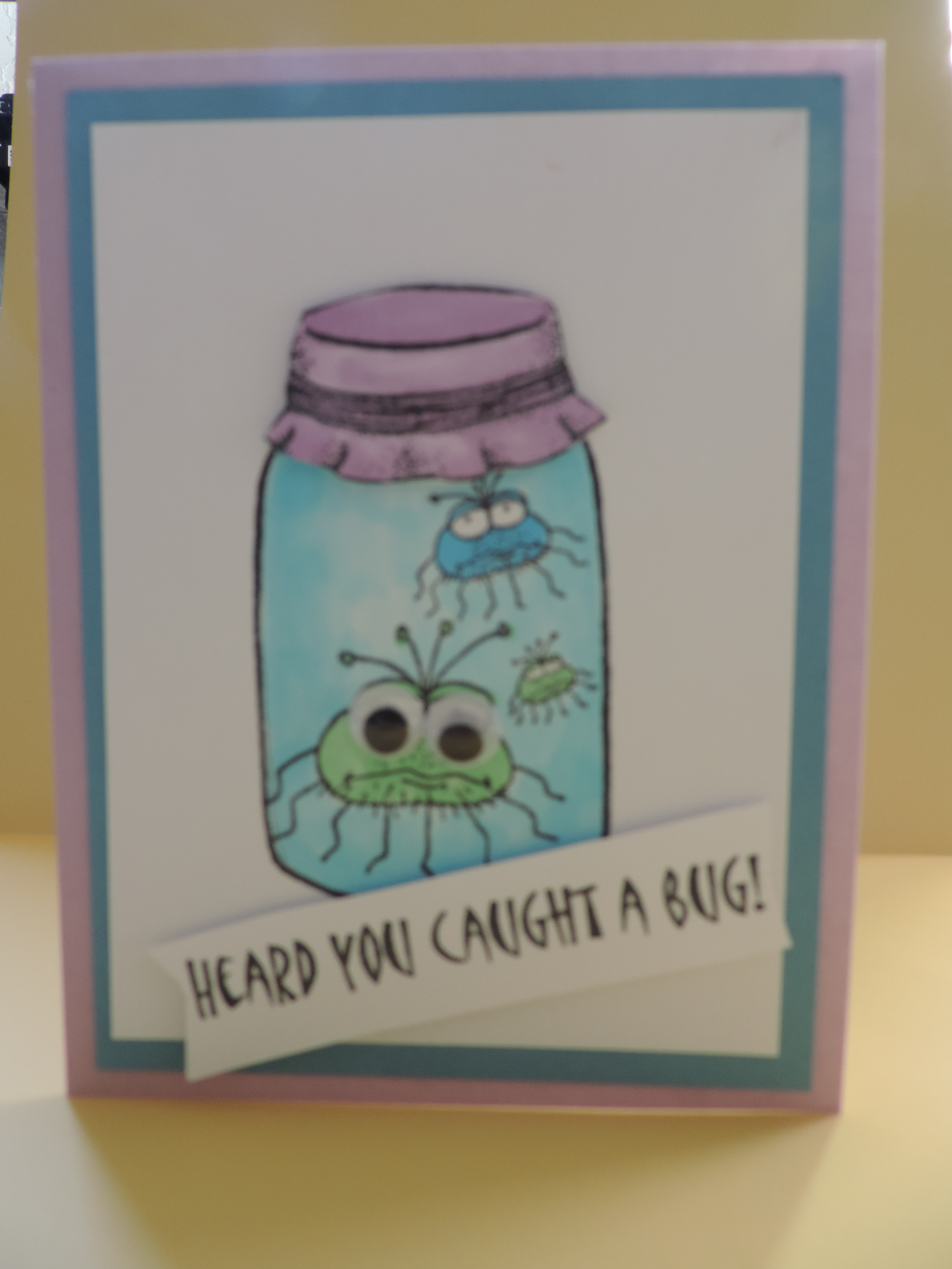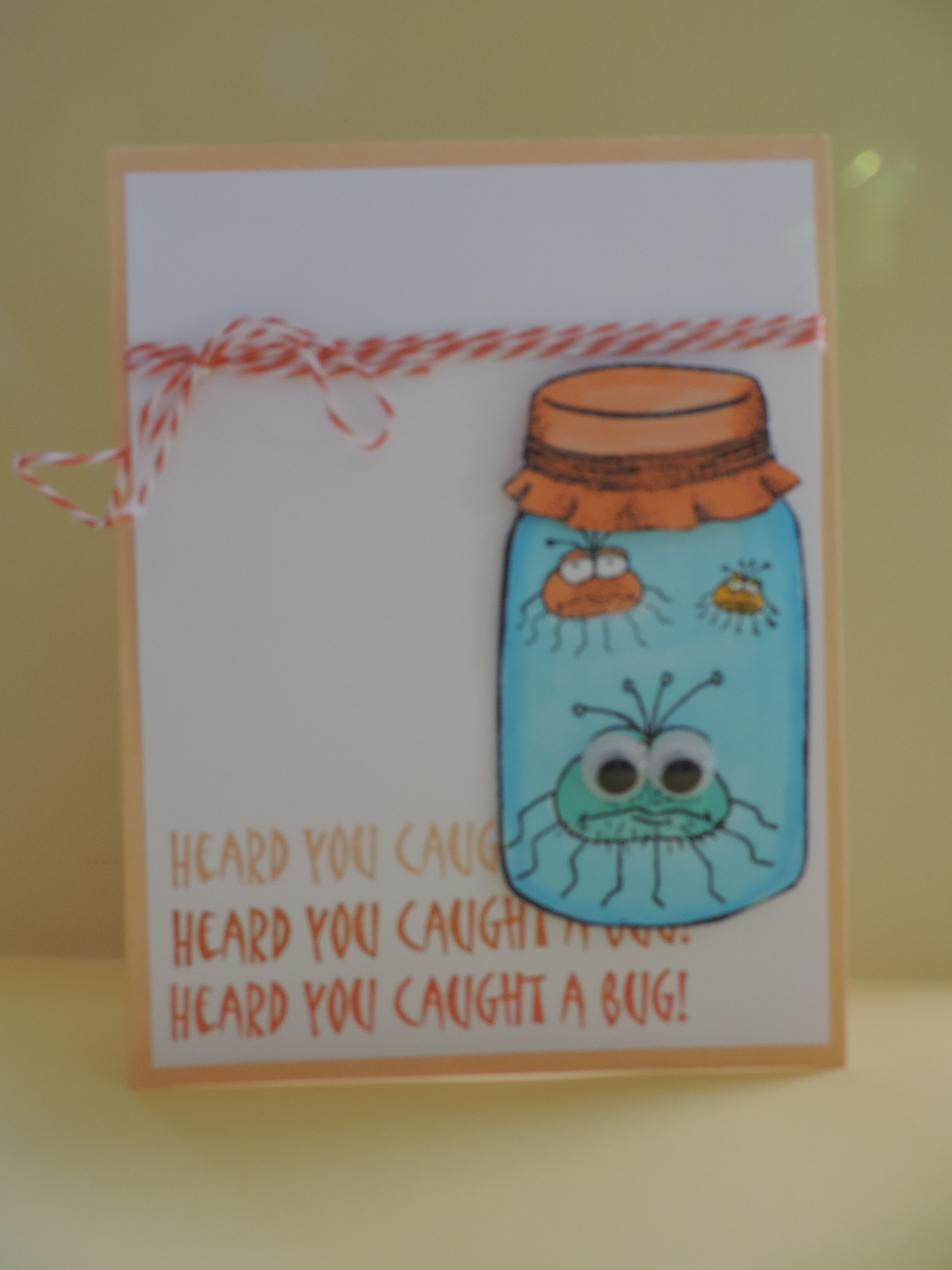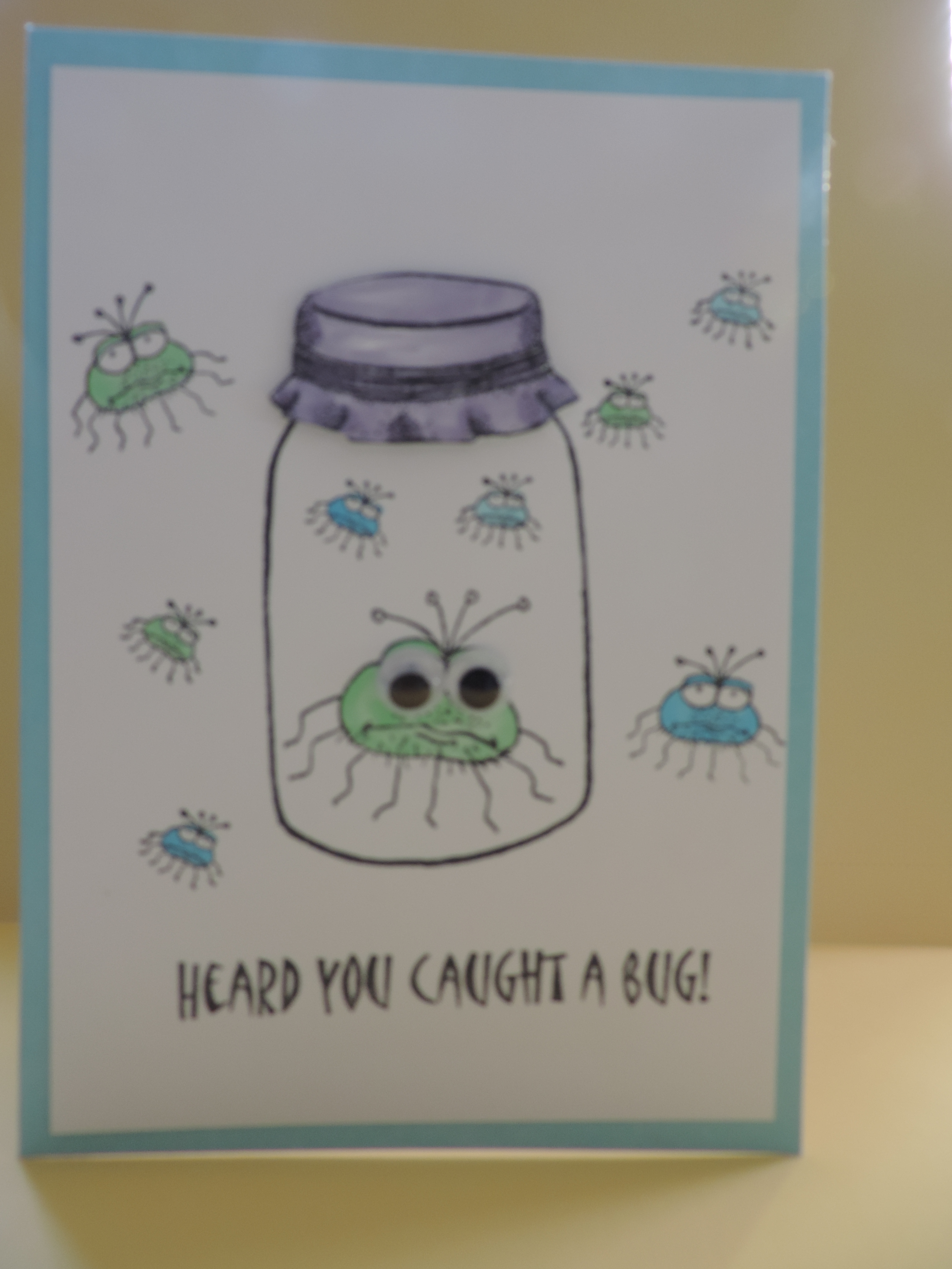 Fun card to send or give a family member or friend who is not feeling well. Using Stamps Set: “510 Bugs in Jar” By Sparkle N Sprinkle; Stampin Up Whisper White and Aqua paper; Copic Sketch Markers: Y13, Y15, B00,B02; Ink: StazOn and Pop up Dots and Wiggley eyes. So much fun to make these cards and give to your sick friend a smile.