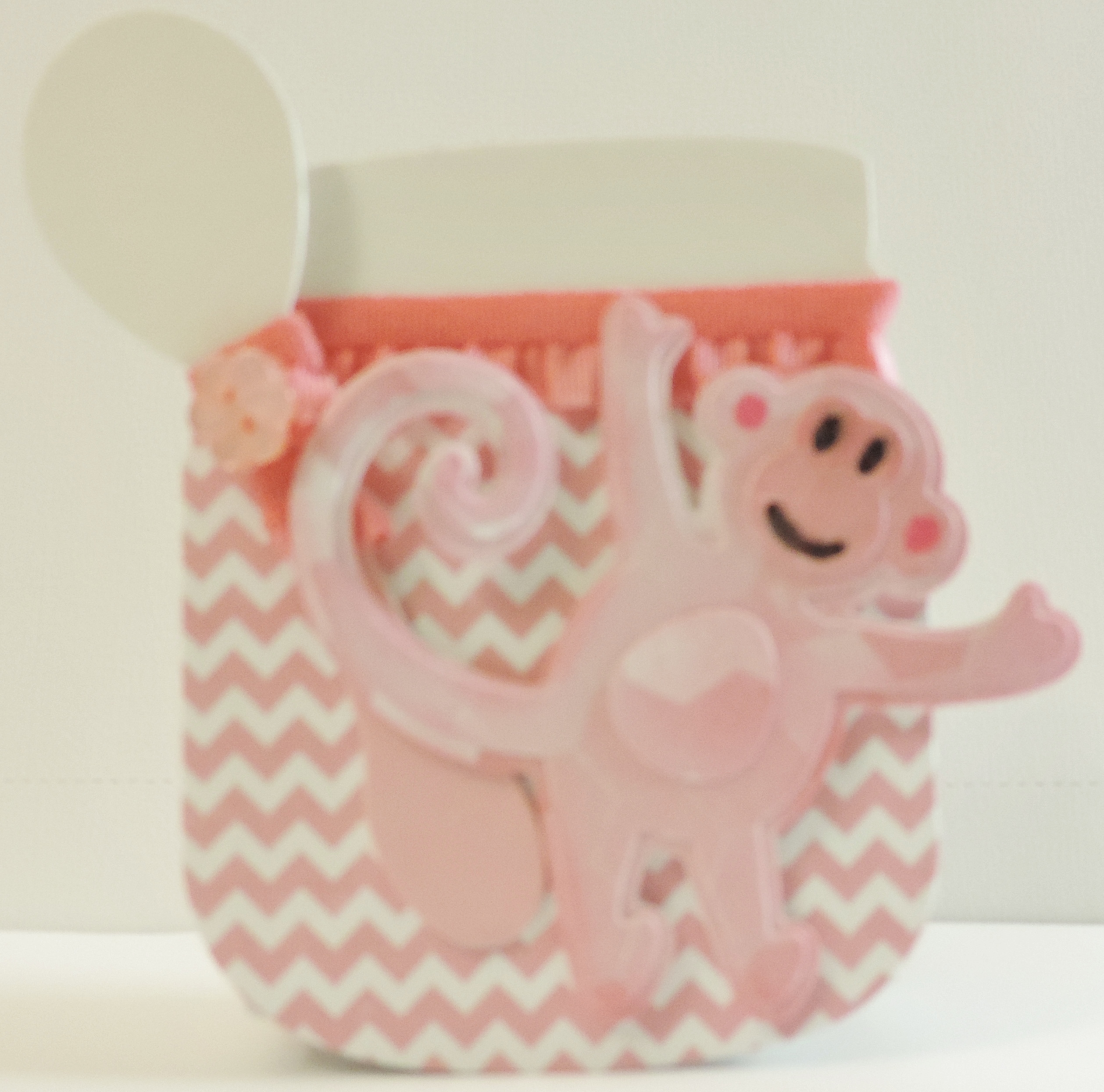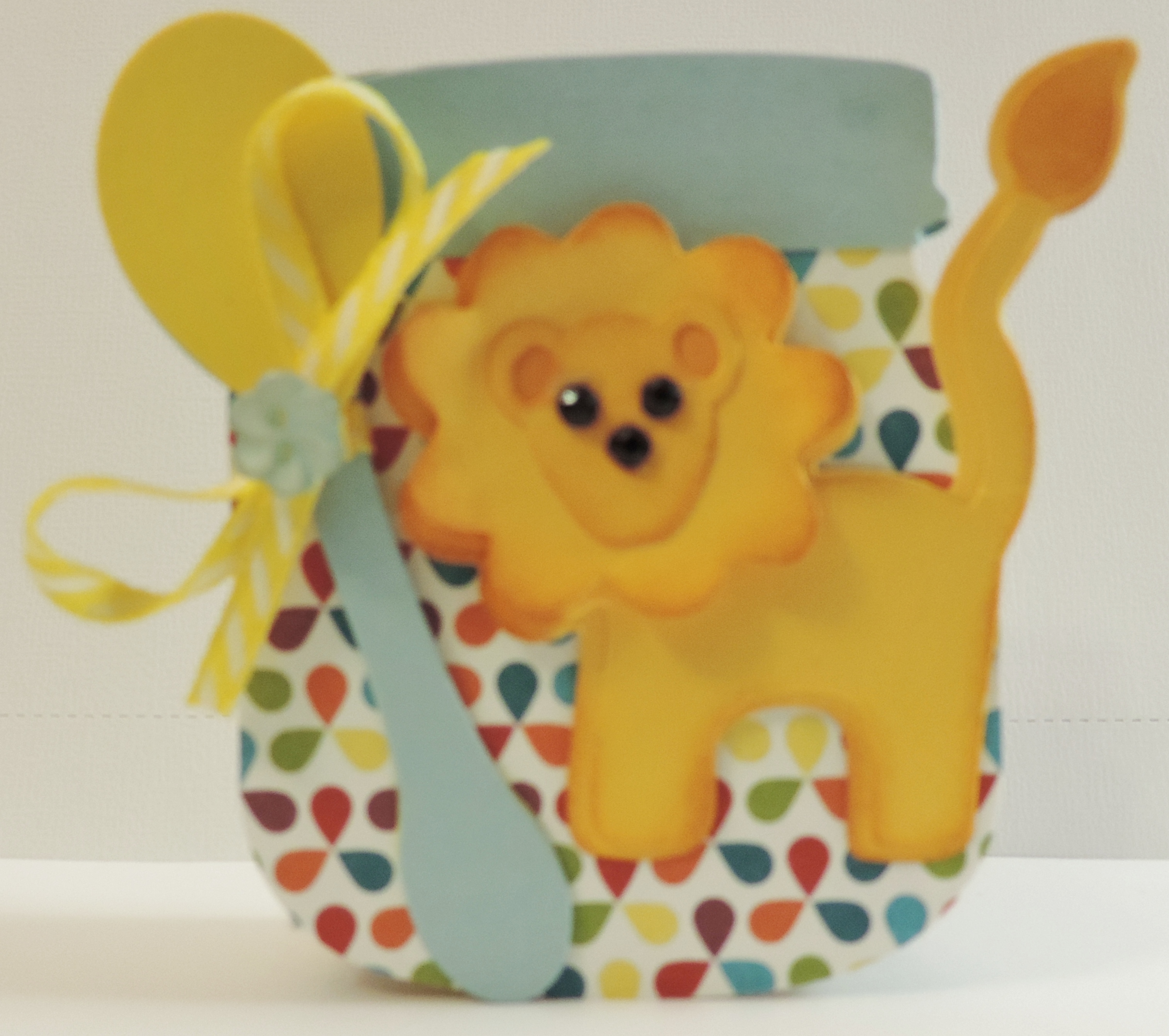 The animal baby jar party favors are made with; cardstock from Recollections simply pastel: Sizzix Die, Food jar 3D & Spoon; Sizzix Thinlits, Monkey, Lion, Giraffe and Elephant; and Stampin Up Ribbon and buttons. This project is simple and adorable, it is wonderful to fill with a treat for a baby shower party favor.