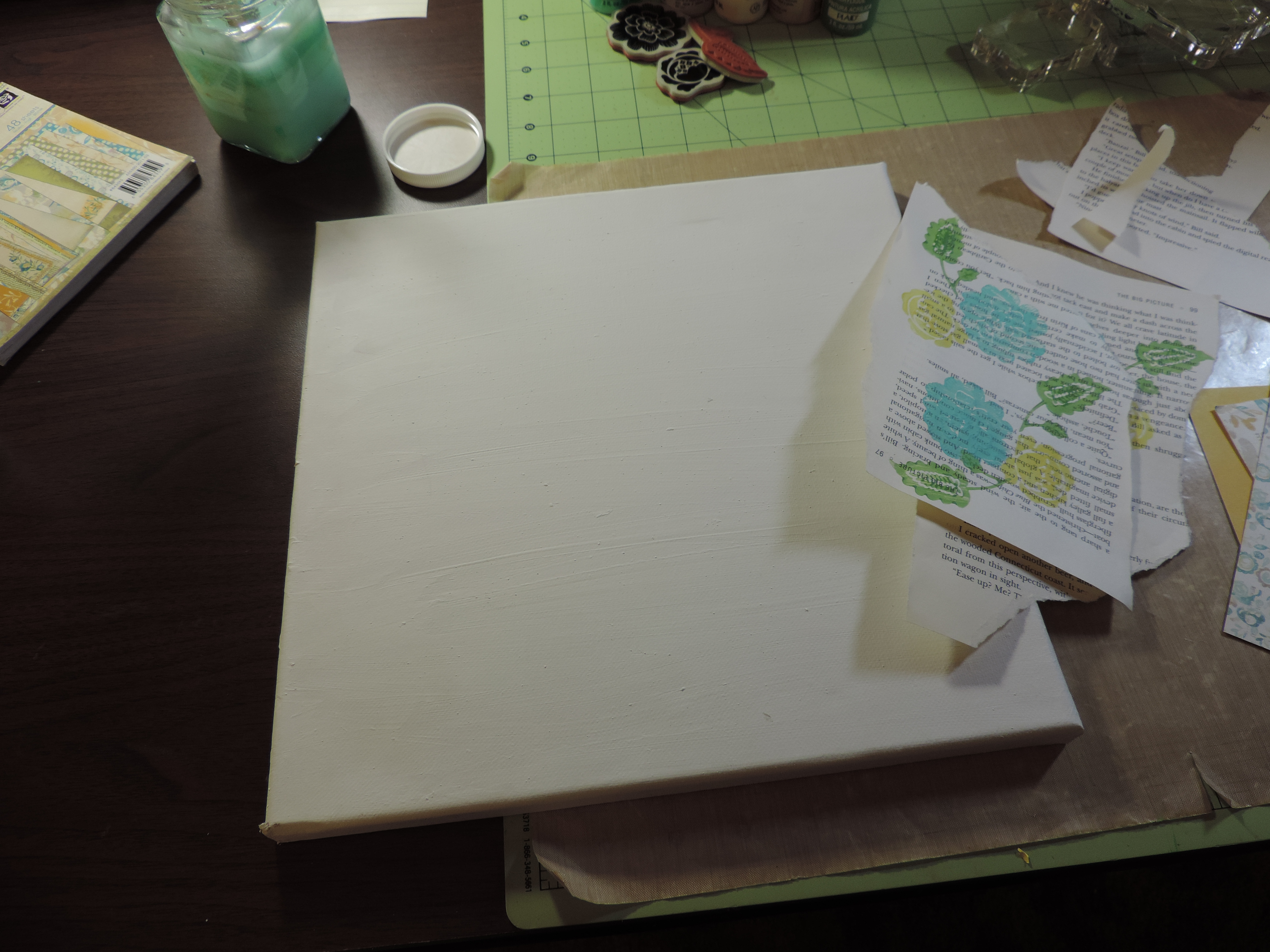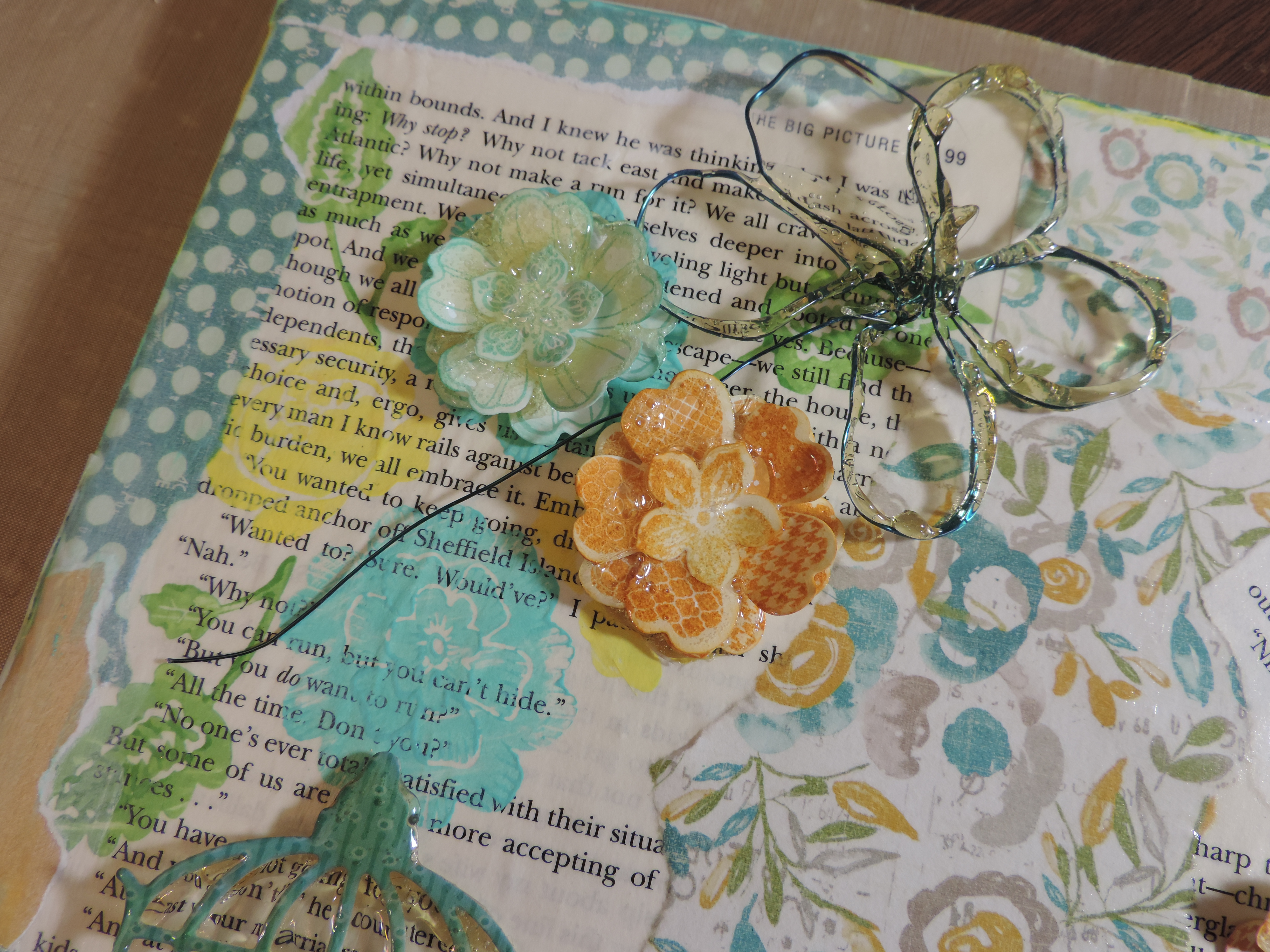 Starting with a 12×12 canvas, then paint with Gesso let dry or use heating tool. Cardstock: Alla Prima Collection 6×6 tear the paper in different shapes and sizes. Also took an old book tore page out and stamp flowers with Stampin Up inks colors were More Mustard, Coastal Cabana and Gumball Green. Using Mod Podge Gloss cover canvas and start laying paper down and cover each piece with Mod Podge then let dry or use heating tool. Then paint side of canvas with Folk Art Acrylic pain colors that I use were Fresh Cut Grass, Sunny yellow, Teal patina. I use a heating tool to dry then I use more of the paper I tore and mod podge the side with paper to blend in. While drying I made embellishments using: Stampin Up: Array of sunshine, flower shop, petita patal stamp sets. Took some wires and made flowers shapes. Then heat up my Melting Pot and used Ultra Thick Embossing Enamel by Ranger. About eight minutes later started to dip my embellishments in making a beautiful glass look. While cooling off I did some texture stamping all around the canvas using gesso and some Tim Holtz stamps to give dimensions. Then finale touch was ranging my embellishments to the canvas.
