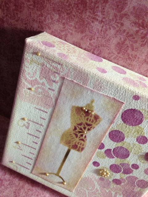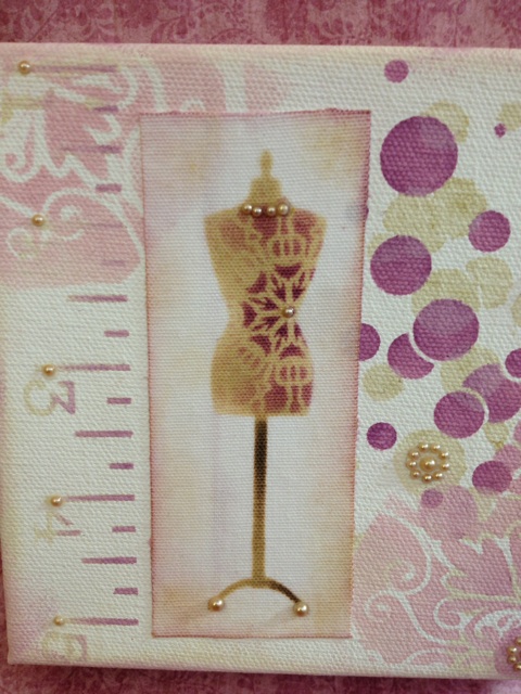 The Dressmaker, on a 6×6 canvas, and sticky back canvas; painted Gesso onto canvases; using Tim Holtz distressed ink, Antique linen, Seedless Preserves, Victorian Velvet, and Walnut Stain; Memory box stencil, Bobbles, Modern Dressmaker, Pattern Heartwood; and then Bling. For questions and/or more information please e-mail me at simplycraftydesigns@yahoo.com.