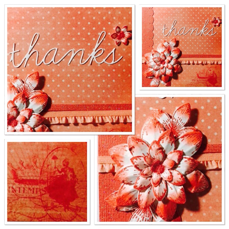 Made with Heartfelt Creations paper and spellbinder die. And flowers were also Heartfelt Creations Botanical Rose Stamp Set and Botanical Wings Die Set. I embossed the flowers with using VersaMark ink and white embossing power. The color them with Stampin Up Ink Crisp Cantaloupe and distress the sides of the flowers.