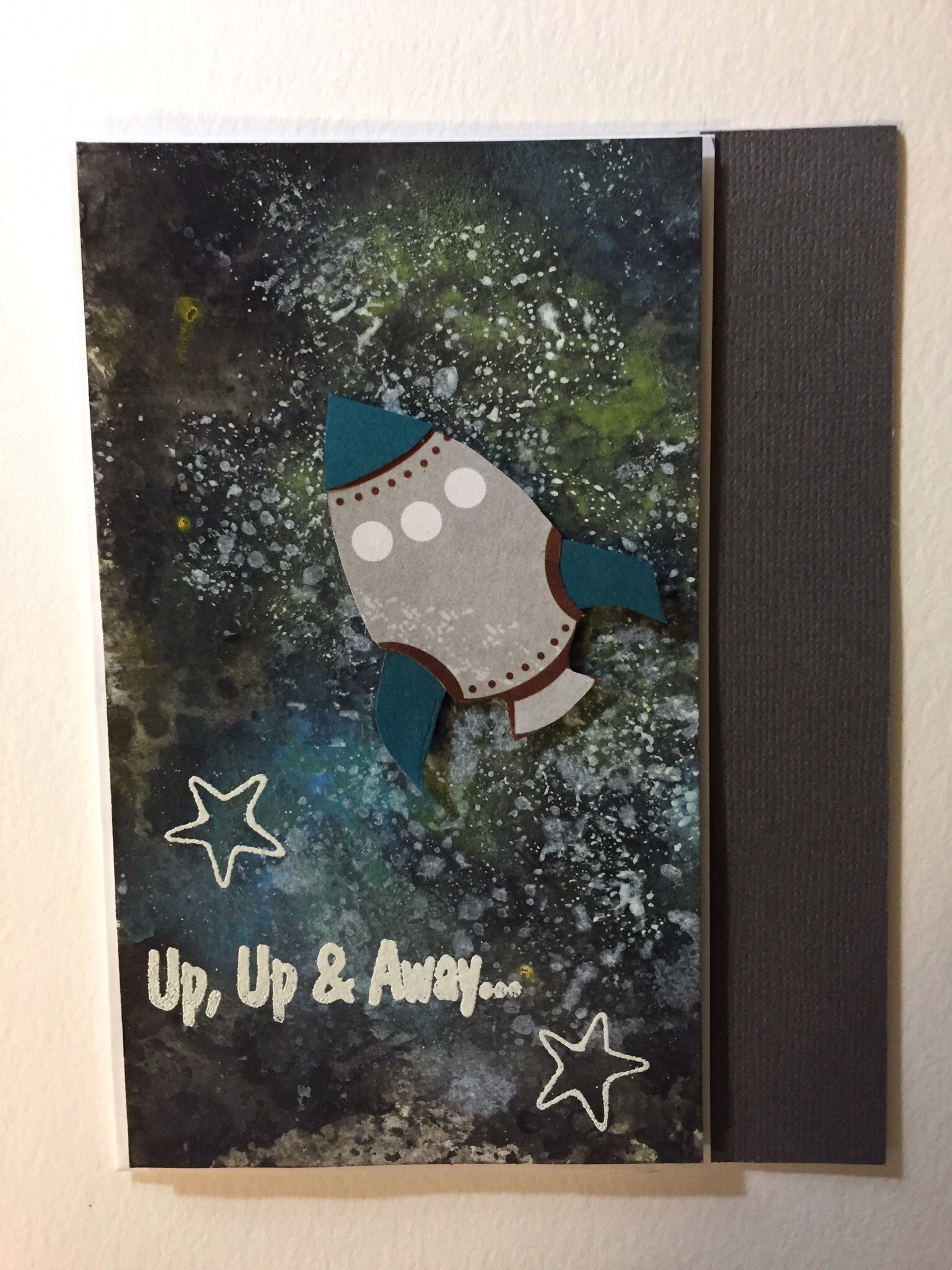 Today, I decided to do a background of the Universe. So, I used Tim Holtz distress paints; Peeled Paint, Picket Fence, Salty Ocean, and Pitch Black. Then, I stamp with VersMark and used White Embossing powder for Up,Up & Away…..and Stars. I cut out the Rocketship, out of cardstock then change the color to match the background. I really like the way it came out.