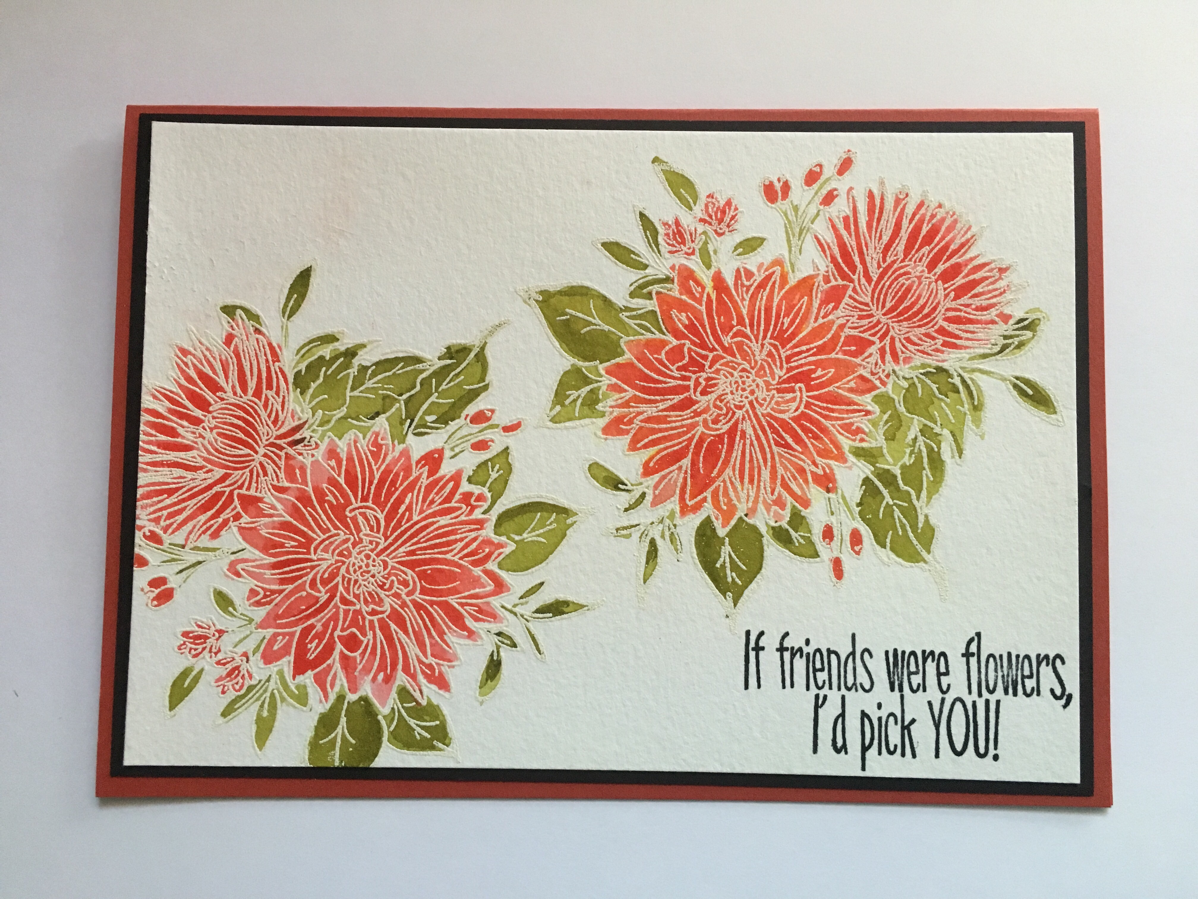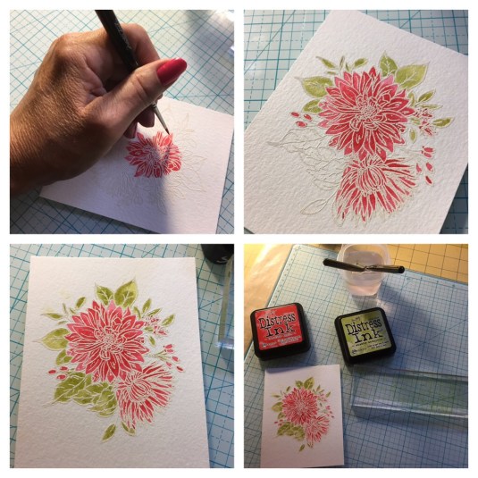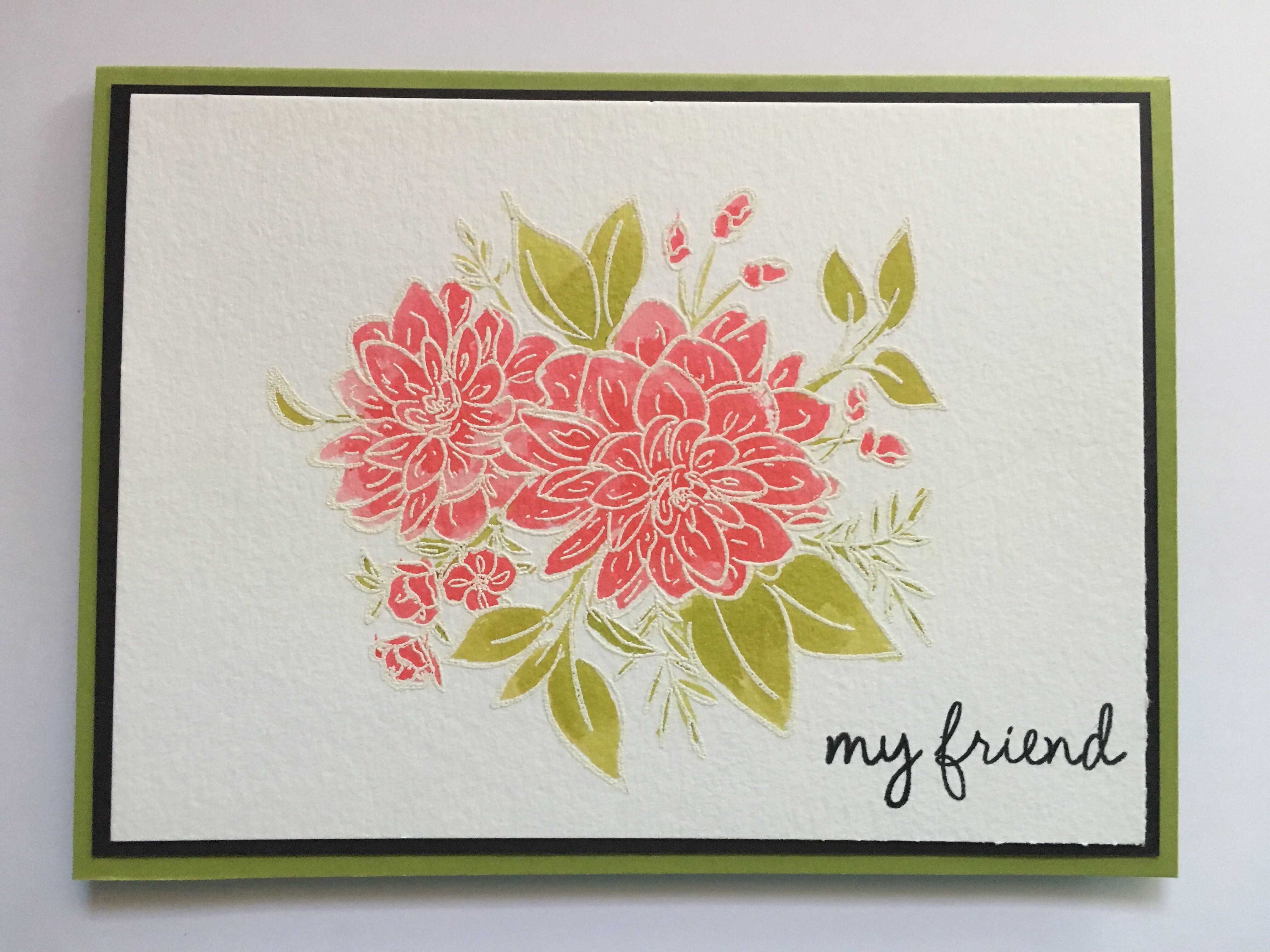 I started out with VersaMark, using detail white opaque embossing powder. Then taking Distress Ink and painting the flowers, leaves, background. I found this beautiful embossing powder called Gold Coast, used for my sentiments.