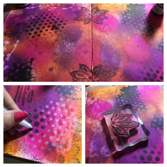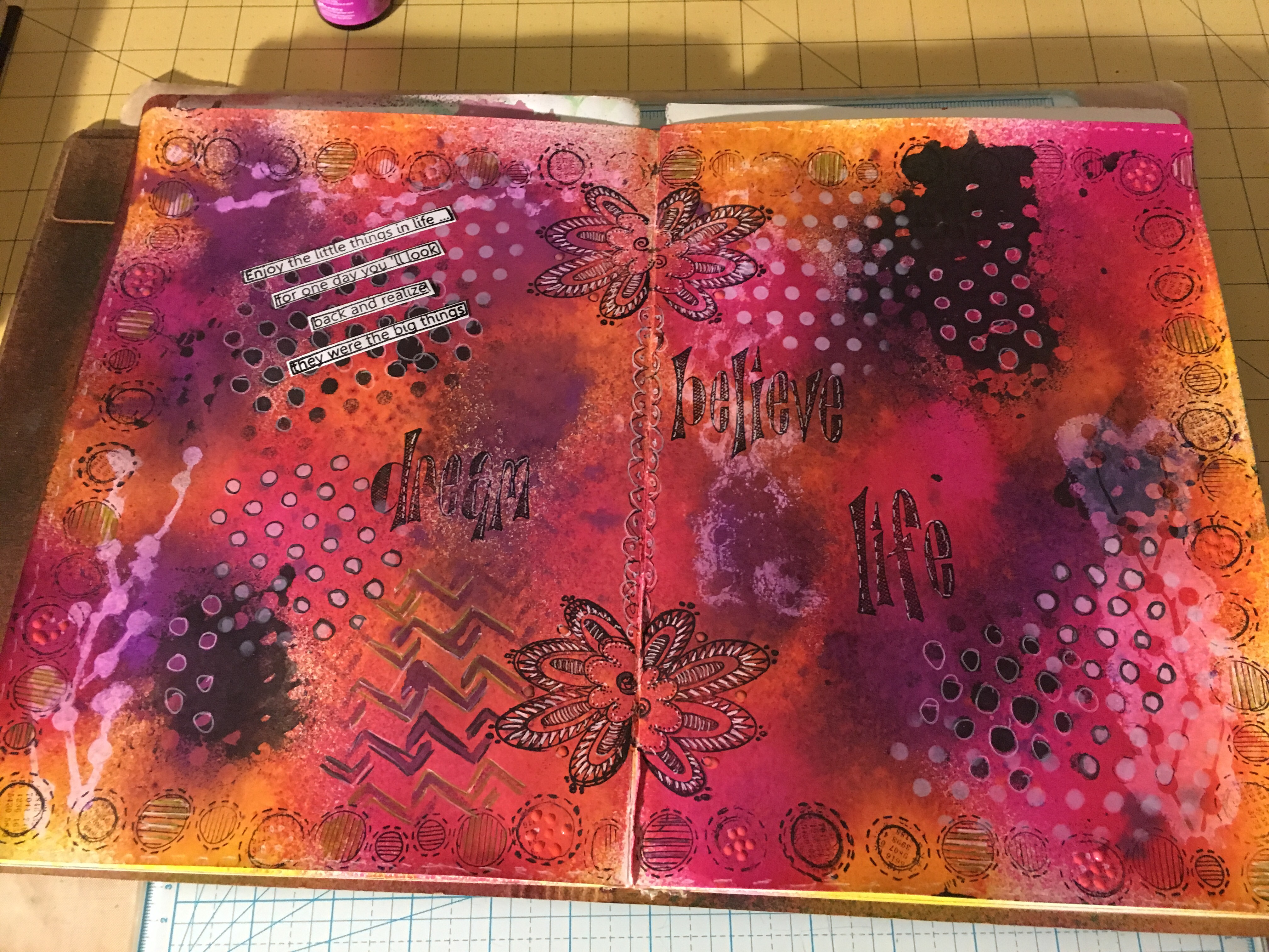 I love Art Journaling, it’s my way of creating something beautiful. I like to pick three colors, then blended them together to give a vibrant beautiful colors. Today, I picked Dylusions ink spray colors: Cherry Pie, Funky Fuchsia, and Pure Sunshine. What I like about doing this is that my pages look like they are done, but I can always go back to it and add more to my Art Journal.