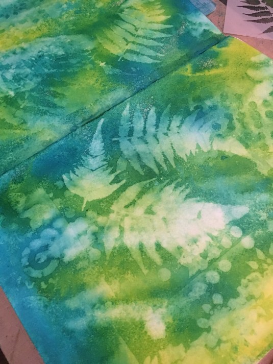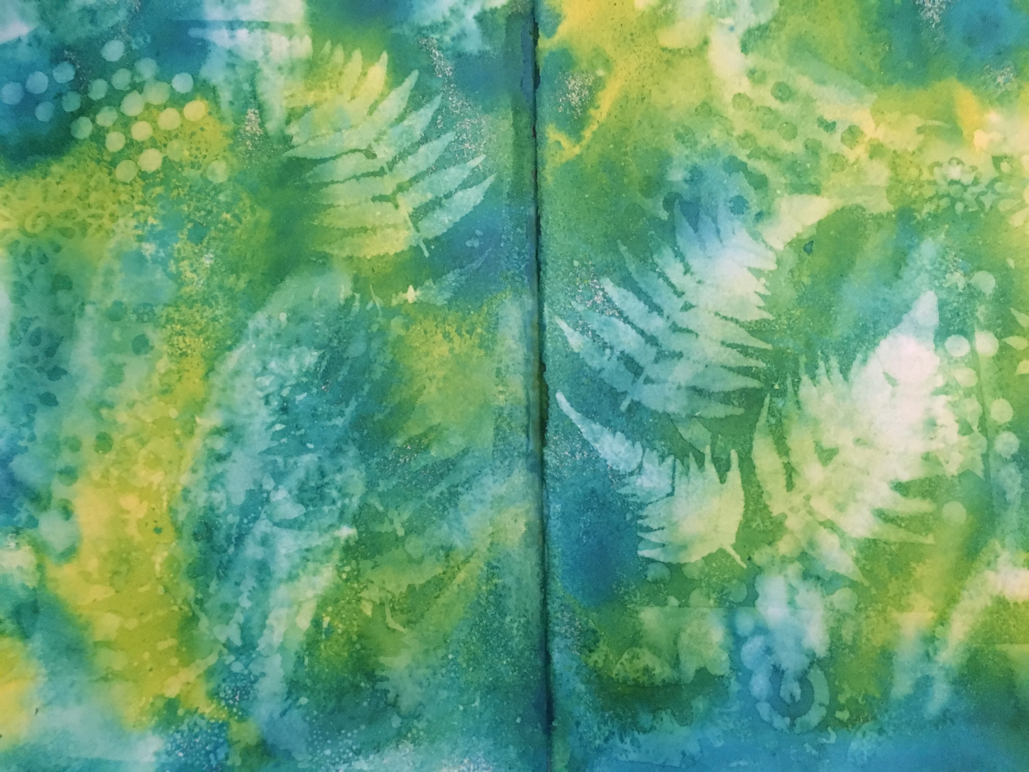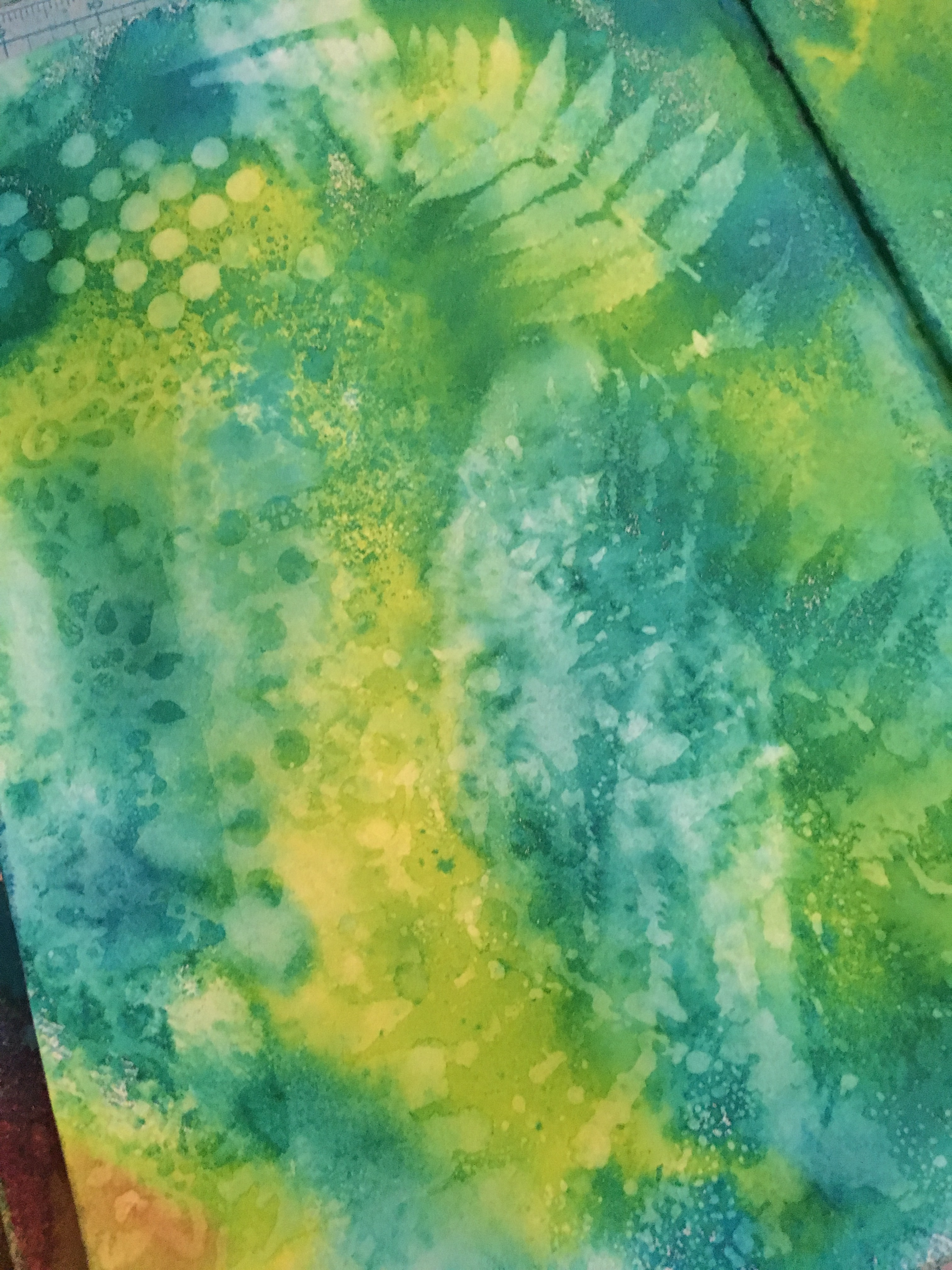 Art Journal a simple and easy background. Sprayed my Journal with water, then added three Dylusions Ink Sprays: Fresh Lime, Campso Teal, and Vibrant Turquoise. Spray randomly with colors. Then, I took my paper towel roll and rolled over the ink. Until I like the way it looked. I then took three different stencils and laid them down and started spraying with water. Then picking up the stencils and laid them down on the opposite page, water side face down. Rolling paper towel roll over my journal after spraying water. Which gave my background a ghost effect. I then continued this effect until I got the results I like the most. If you like my post, please give me a thumps up or comments on my post. Thank you!
