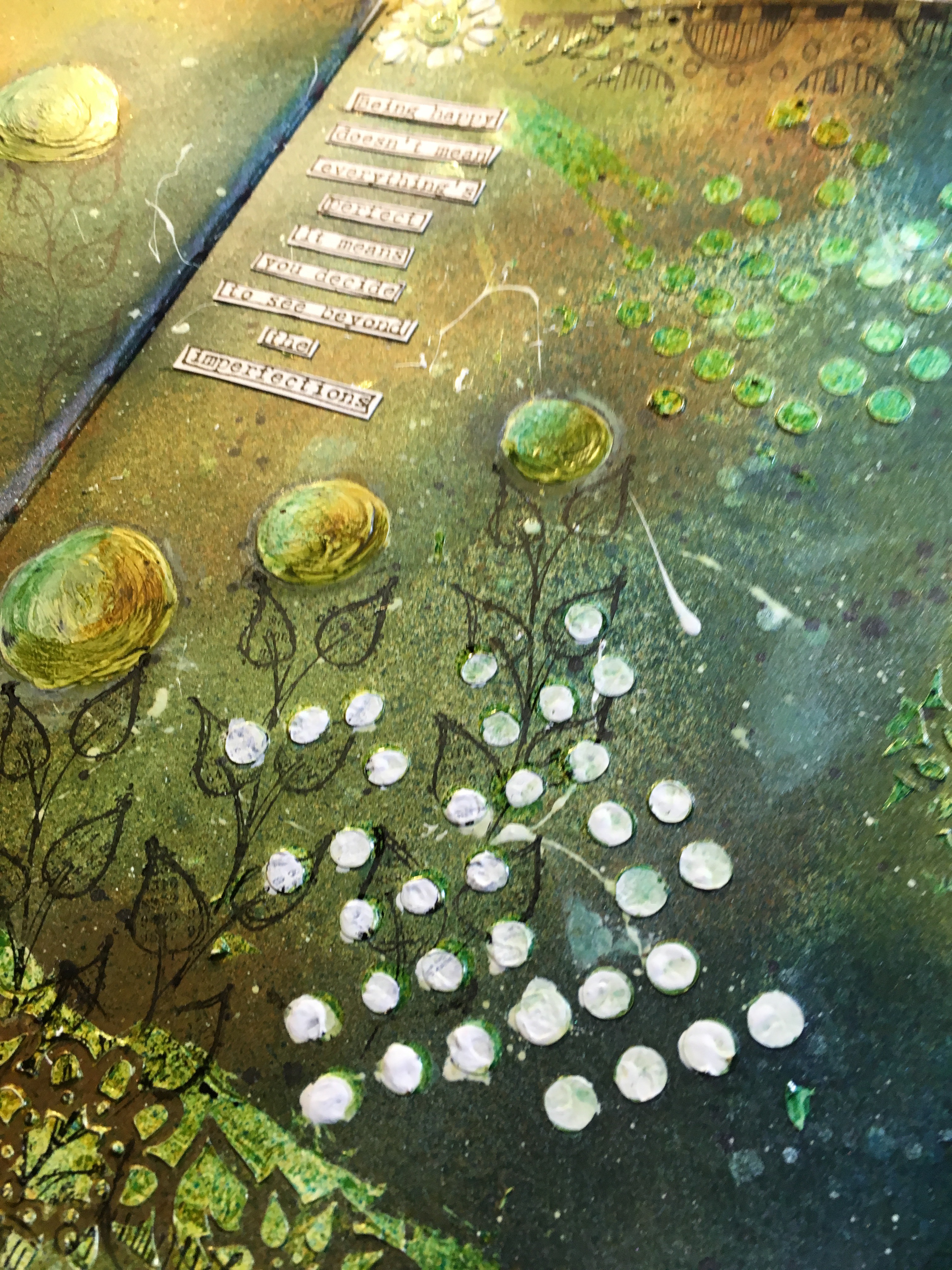 Sprayed some Tattered Angle Pearl Mist onto an acrylic block. Then proceed to dab it onto a round tip soft paint brush, then dabbing onto my ground color of my card stock, doing this moves way some of the ink and gives it a shine.