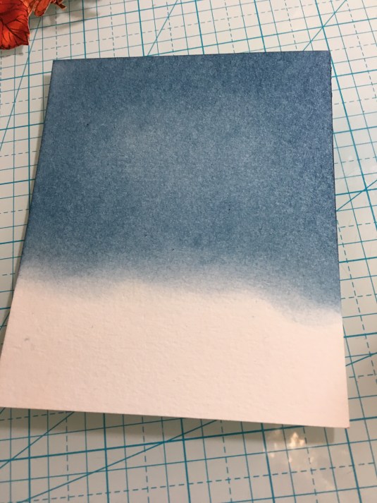Then I took a watercolor Cardstock and used Tim Holtz Distress Inks colors Stormy Sky and Faded Jeans for the sky. For the ground I used Vintage Photo and Walnut Stain.