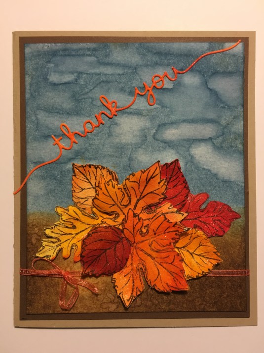 Took the Winke of Stella brush and colored the leaves with it to give it a shimmer. Made the “Thank You” wording with Lawn Fawn die.