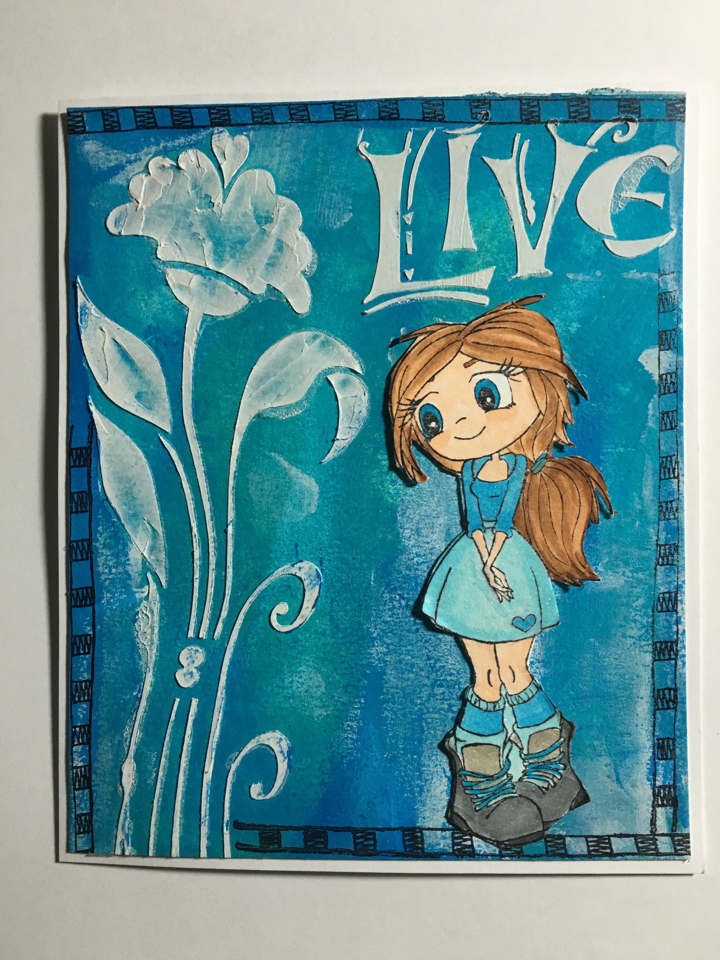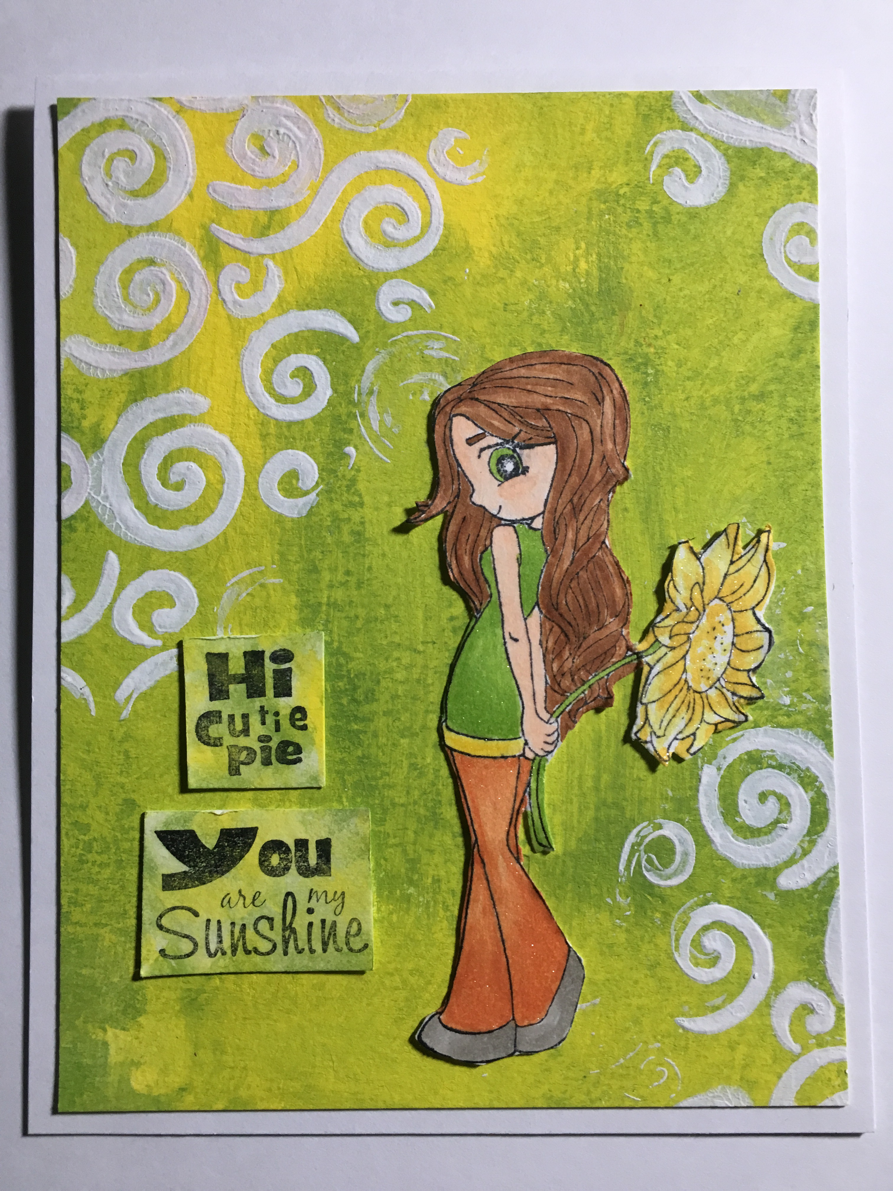 What I used for these three cards were Dylusions Paints on background. I love the way the paints blended together, the colors are so vibrant. I used Whimsy Stamps and colored the girls with Copic Markers with Wink of Stella brush to give them a shimmer look.