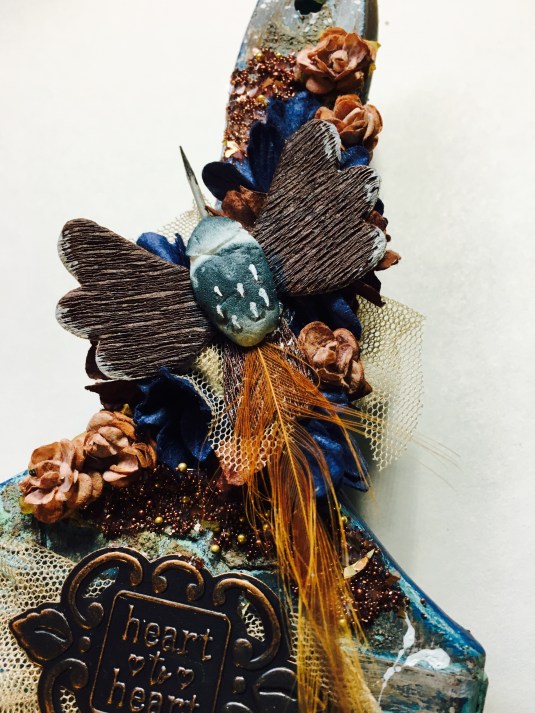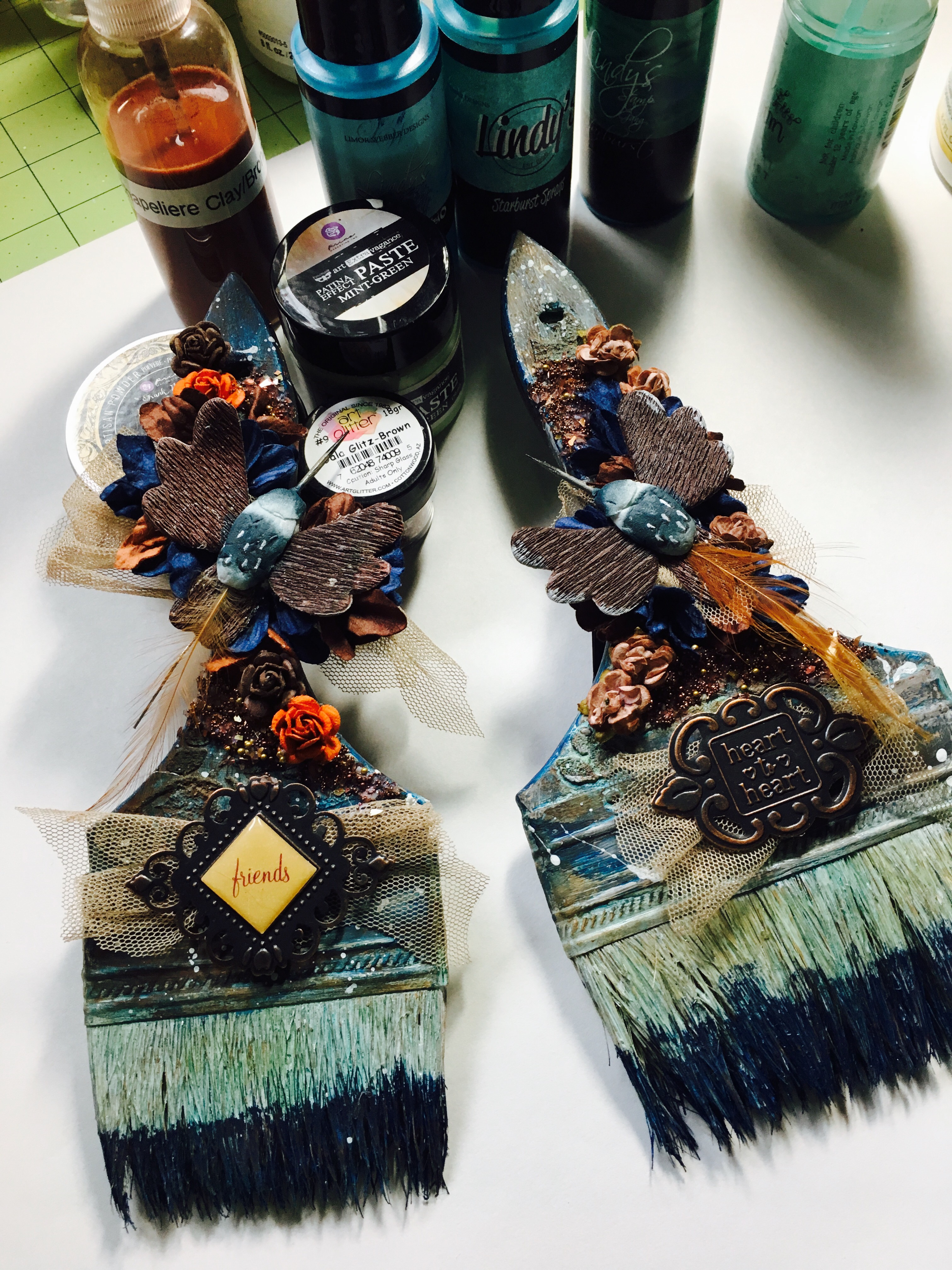 I took a couple of old Paint Brushes and created beauty. Used white Gesso, Lindy’s Sprays; tilt-a-wheel teal, sassy shapphire, jack in the pulpit teal and Prima Spray; soft teal. I mixed Prima Memory Hardware Clay in a water bottle then spray, which gave the brushes a antique look.