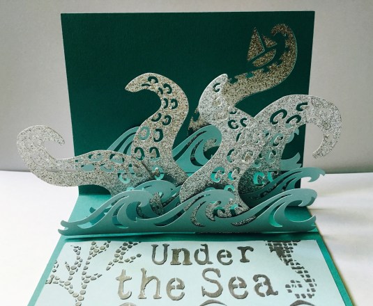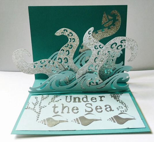 Making pop up cards are fun to create. This one I used silver glitter paper for the octopus, Blue Cardstock for the waves and a Teal color on background. Then I used TCW stencil and silver Paste for the Under the sea. 😀