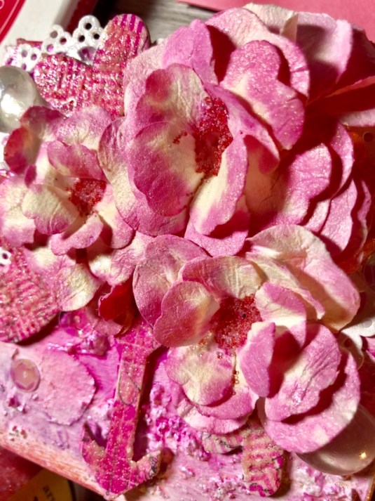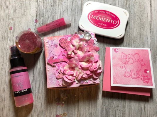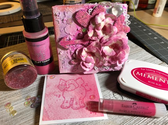 White Gesso, Finnabair Paper Texture Paste, Heart Stencil, Heidi Swapp Chip board hearts and arrow. Lindy’s spray Raspberry Lemonade, Memento Ink Rose Bud, Gelato Watermelon, Finnabair Micro Beads Blush, Recollections flowers put together and painted with also Lindy’s spray. And Stickable Stamp Elehant Heart. Finished off with clear Shimmer Mist for shine and some Sequins.