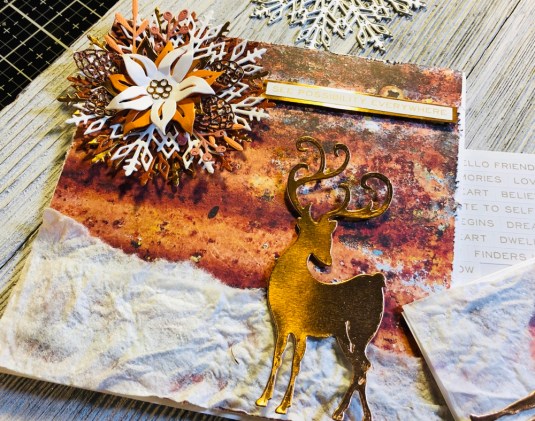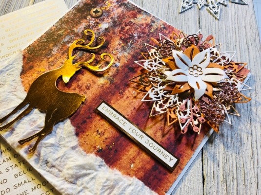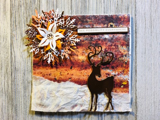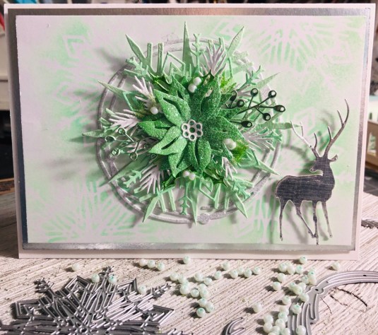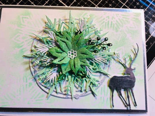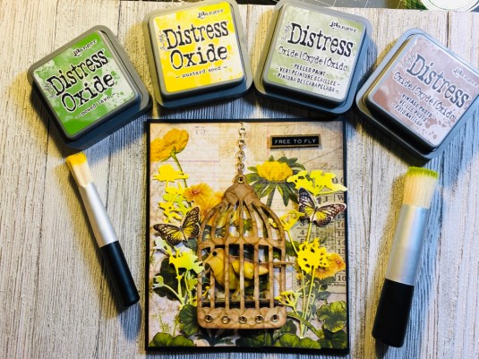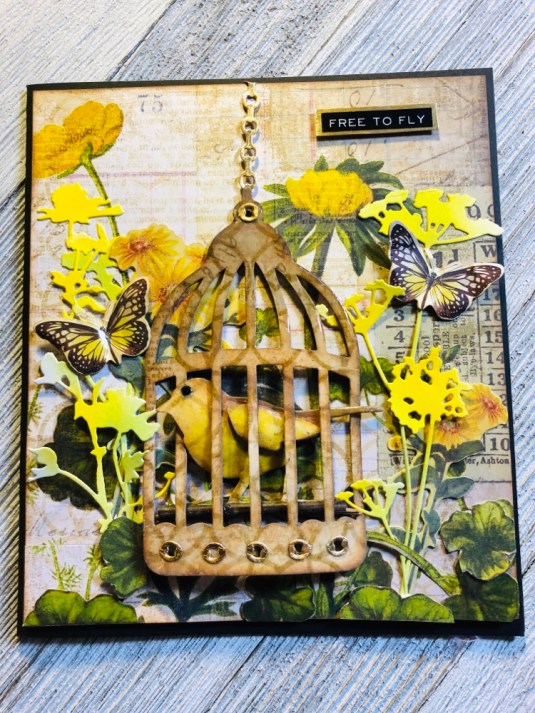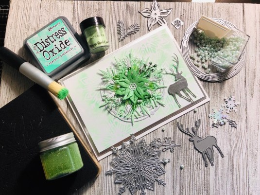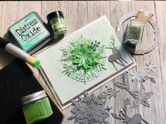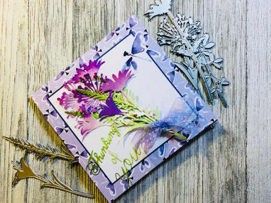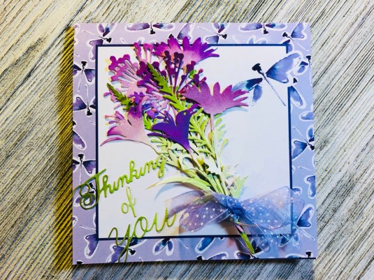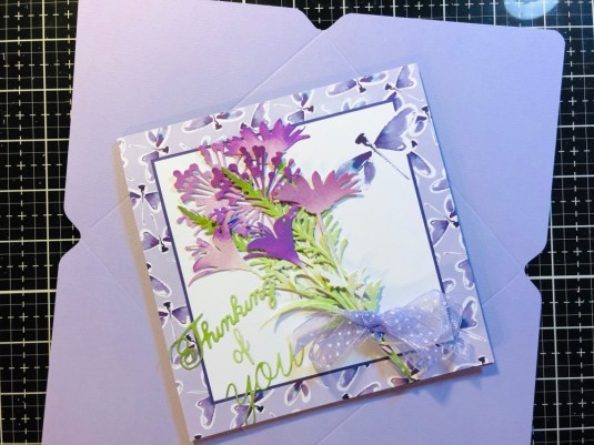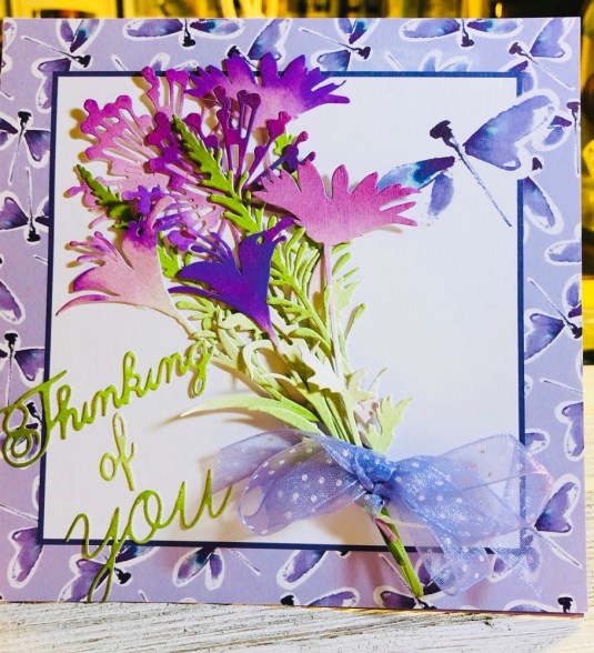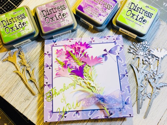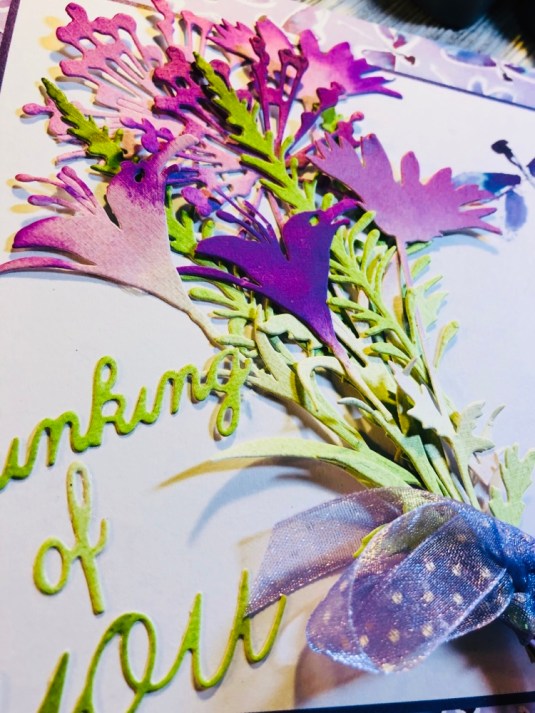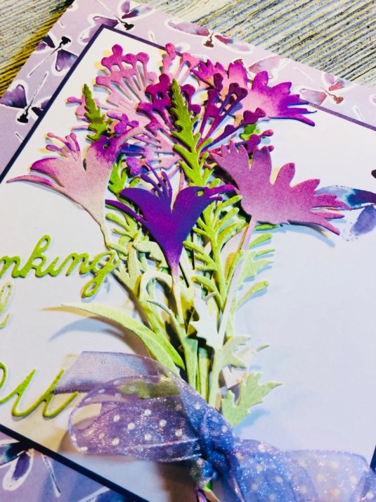 All the products I used: Tim Holtz Wildflower Stems 2 Thinlits 664164 and Tim Holtz Distress Oxide Mowed lawn, twisted citron, dusty concord and wilted violet. Sizzix Thinking Of You dies. Also Purple ribbon with white dots. Cricut White Kraft Stock, Recollections color Splash paper pad and Kathy Davis Journeys printed cardstock.