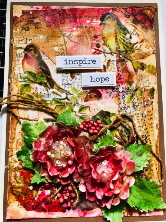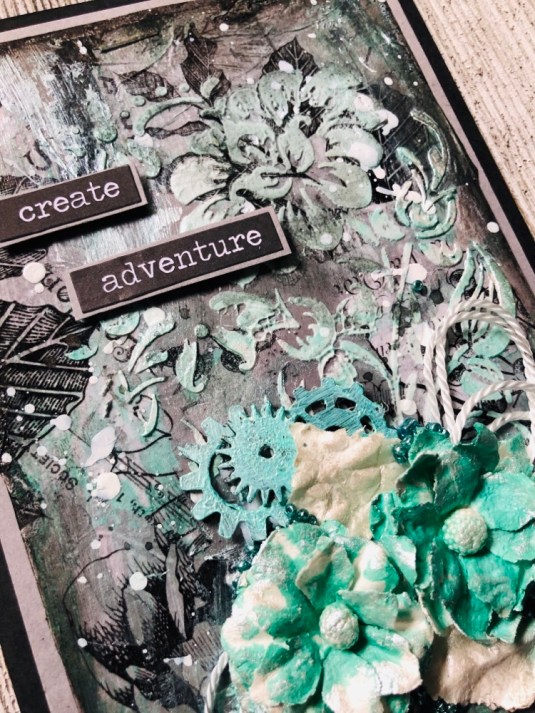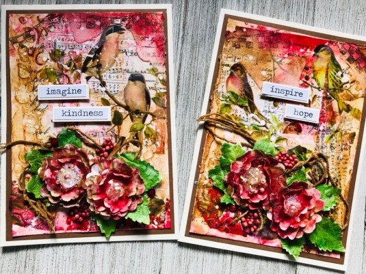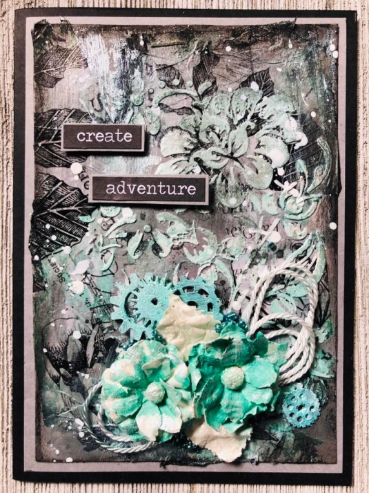Hello my friends, today I wanted to work with colors out of my Comfort zone. So I took Tim Holtz idea-ology Botanical Collage Paper which is black, white and gray. And made theses cards. I’ll list products down below.