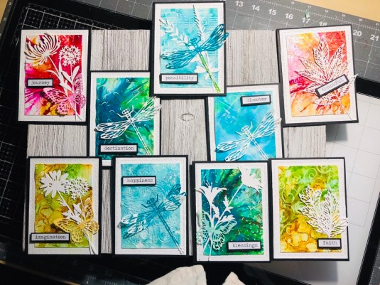 Hello my friends! Today I wanted to create cards with Tim Holtz alcohol inks and more. While I was making these nine cards, I thought of Impact Church in Paris, Texas that I attended with my Son and his family every-time I visited. I will be visiting my family again in a few weeks. I’m donating theses cards to the Impact Church. Each cards has one Inspire Word on them, I would like them to give each cards to someone to inspire them like the Church has Inspire me.