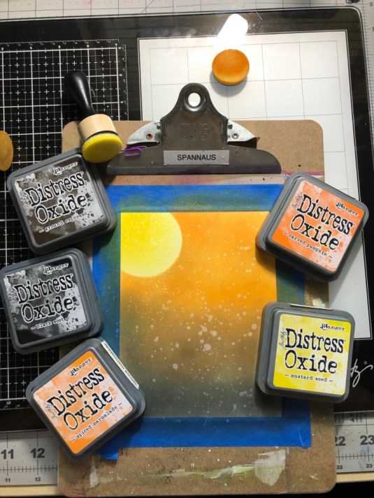 Background colored TH distress ink mustard seed, carved pumpkin, spiced marmalade, ground espresso and black soot.