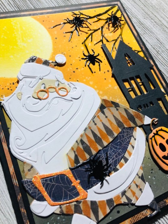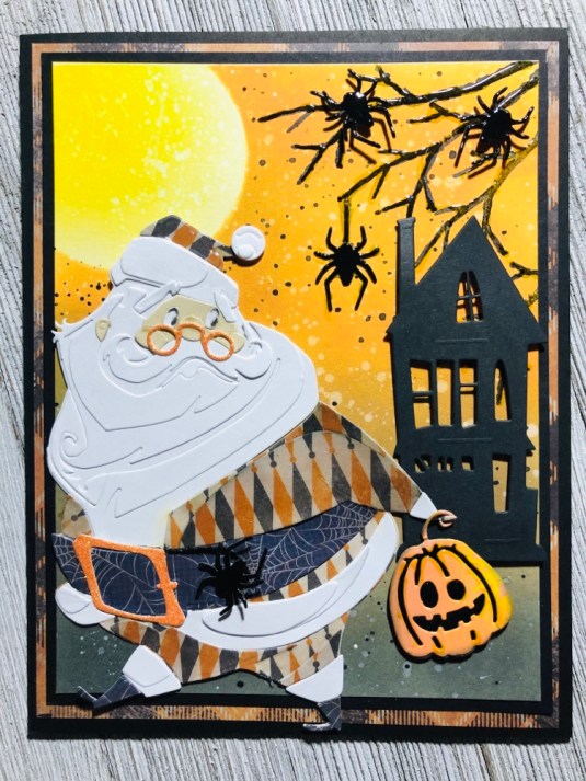 Hello my friends! Today I wanted to work on the New Tim Holtz Jolly St. Nick Thinlits. But I’m still not ready to work on Christmas cards yet. So I came up with this idea to create Santa in a Halloween suit. And I must said, I love the way the card came out. Hope you guys like it. Products listed down below.