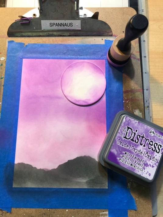 Here I used Tim Holtz Distress Oxide Black Soot, Wilted Violet, Seedless Preservers, Dusty Concord and Hickory Smoke.