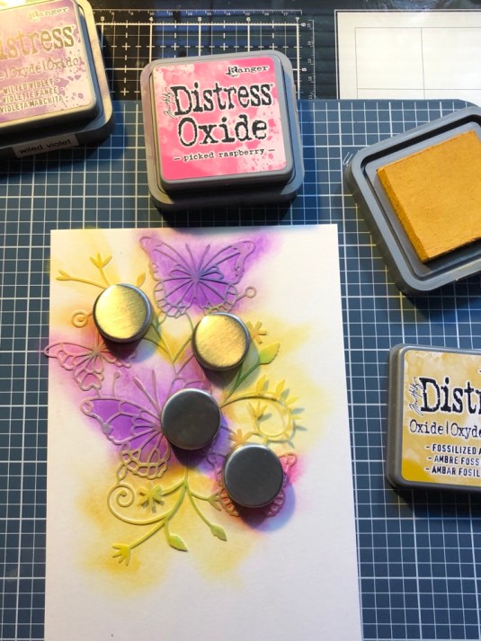 Picked out three of Tim Holtz Distress Oxides picked raspberry, wilted Violet and fossilized amber.