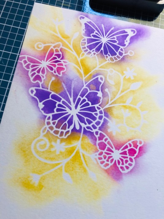 I place some Strathmore water color paper down, then place memory box stencil called butterfly vine and set magnets on top.