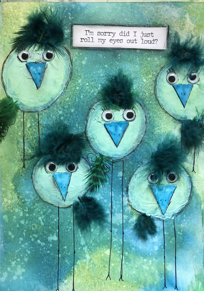 Other products I used: Tim Holtz Big Talk snarky Impertinent stickers. Finnabair impasto heavy body acrylic paint mint. Sharpie black permanent marker. Google eyes, turquoise feathers and Nuvo deluxe adhesive.
