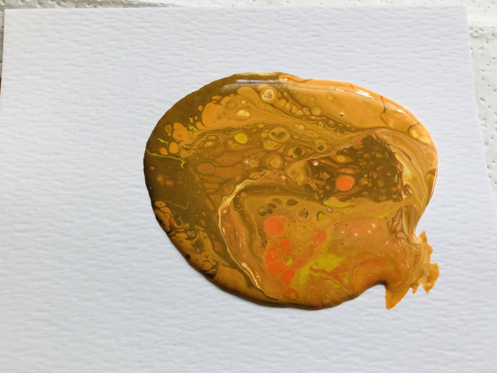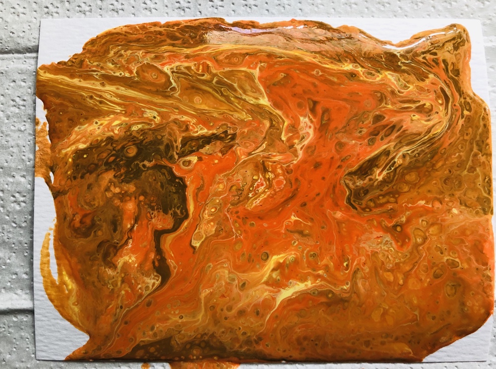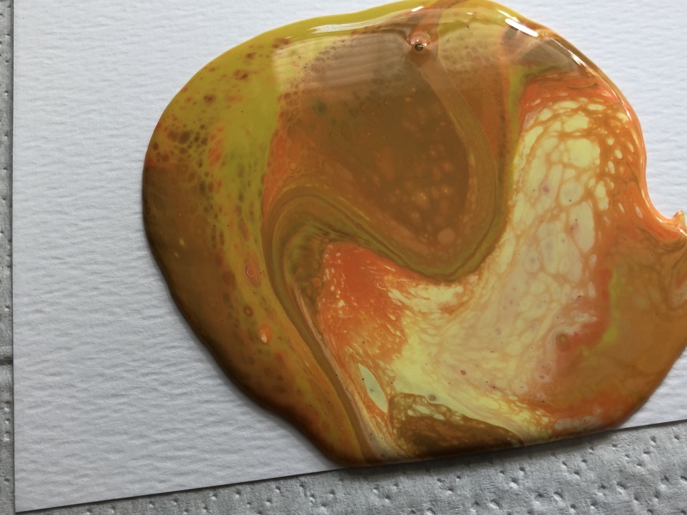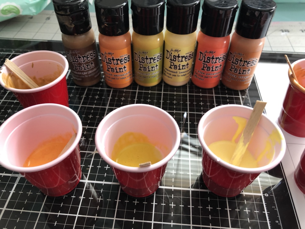 I took Tim Holtz Distress Paints fluid acrylics and mix them in a cup, add a medium and mix well. Then pour into a cup and flip over on to his water color paper. Colors are Tim Holtz distress paints spiced marmalade, ripe persimmon, rusty hinge, squeezed lemonade, vintage photo and crushed olive fluid acrylics. Moved the paint around side to side and up and down. Let dry for a few hours. I did this process three times on to Tim Holtz water color card stock.