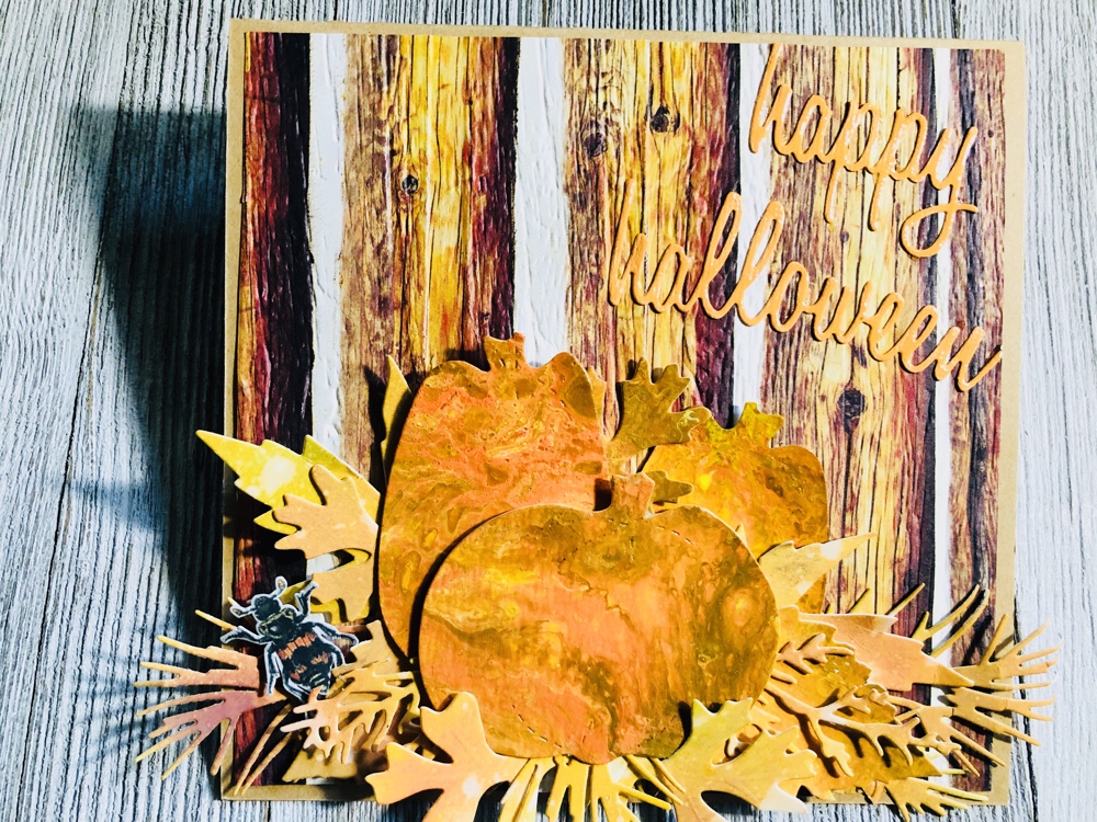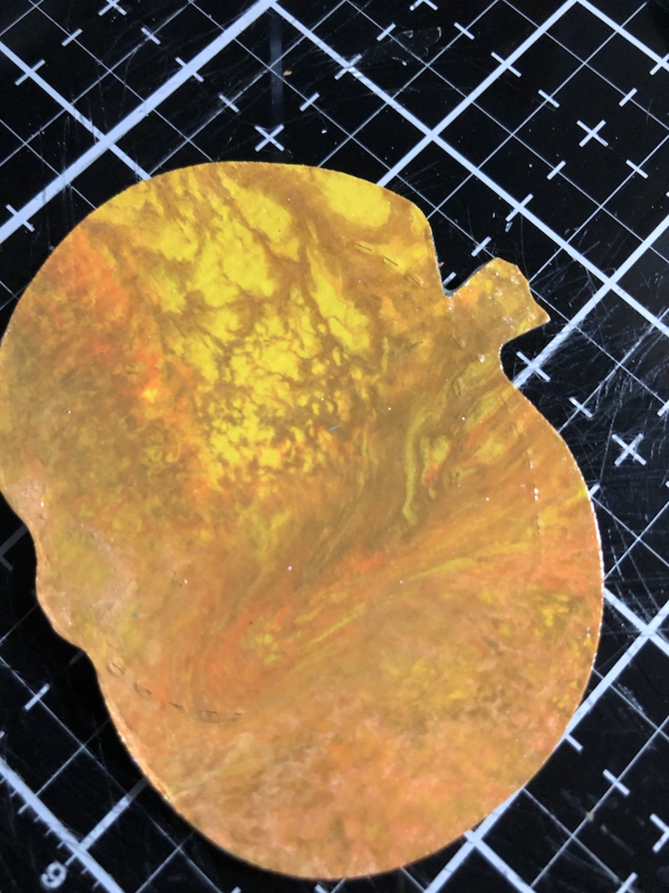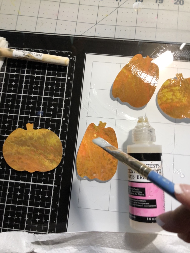 After my acrylics pours were dry, I used my Tim holtz Vangabond 2 and Sizzix die Pumpkins 2 and cut them out. Then brushed ranger glossy accents over the pumpkins. Let air dry.