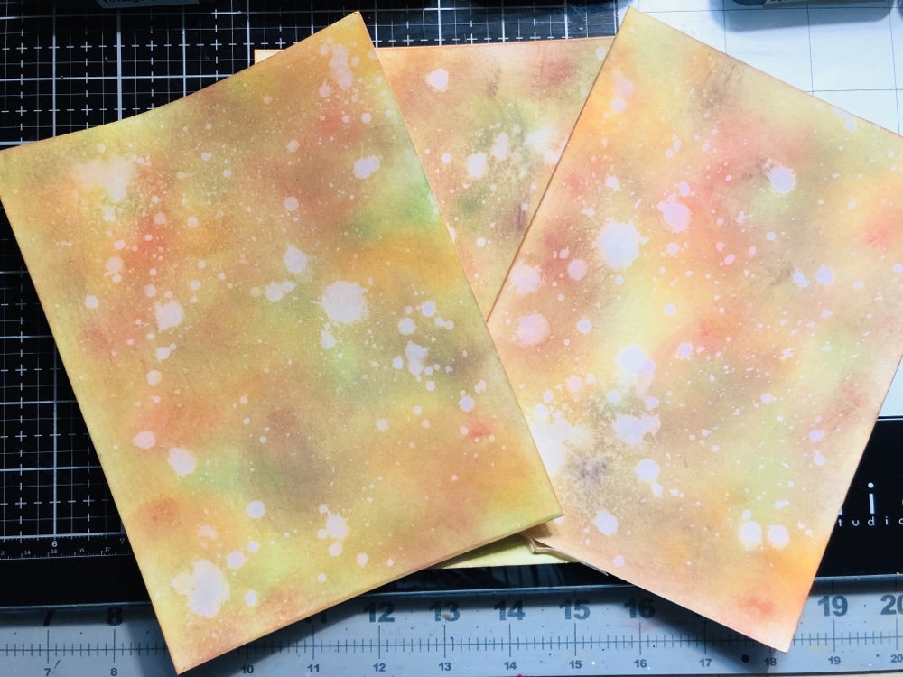 Took Tim Holtz distress oxides squeezed lemonade, candie apple, spiced marmalade, peeled paint, mowed lawn and vintage photo. Blended them on water color paper and drip a little water and tapped it with a paper towel.