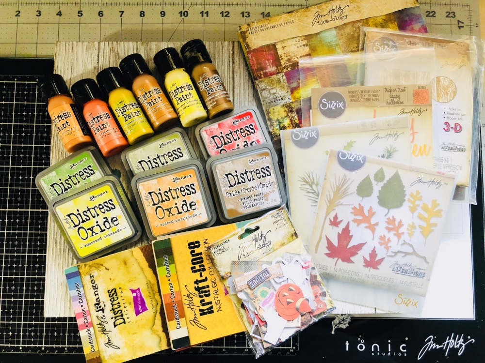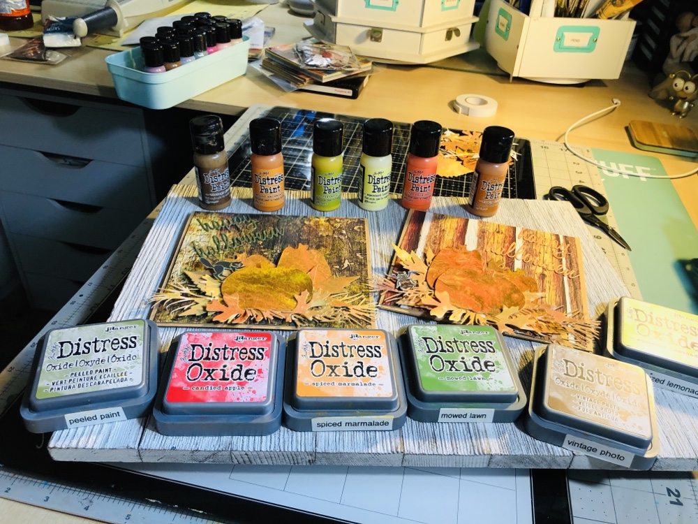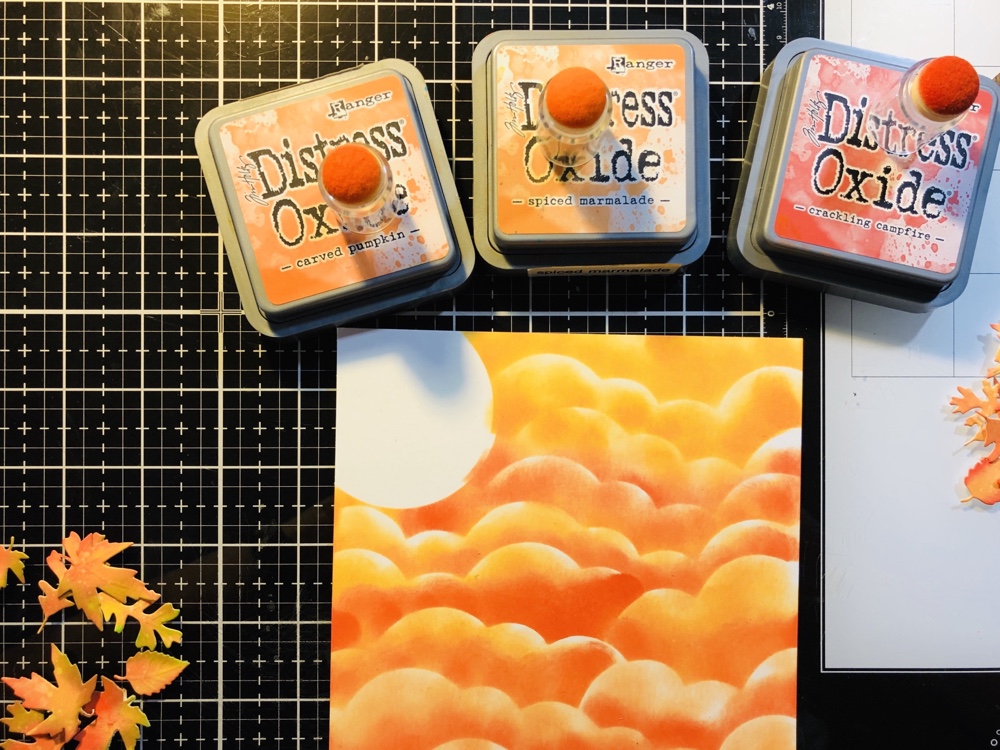 I used Tim Holtz Distress Oxides carved pumpkin, spiced marmalade, crackling campfire, mustard seed, mowed lawn, vintage photo and black soot. Also used Tim Holtz distress stain vintage photo and walnut stain on tree. Plus 3-D texture fade Lumber # 662718. Background was done with just three colors carved pumpkin, spiced marmalade and Tim Holtz new Distress oxide crackling campfire.