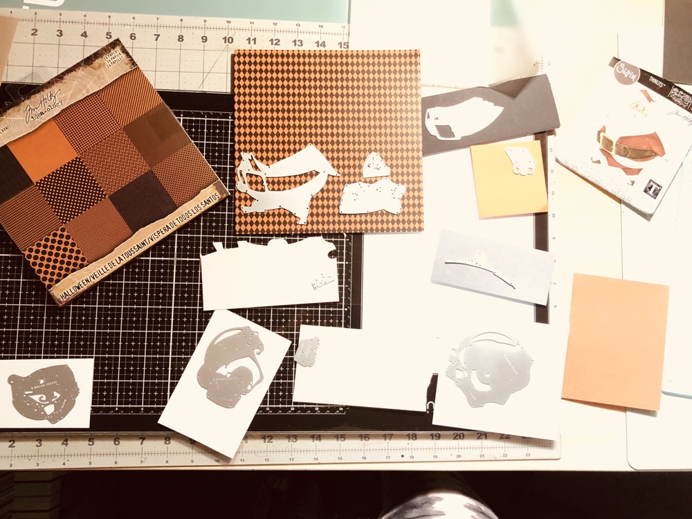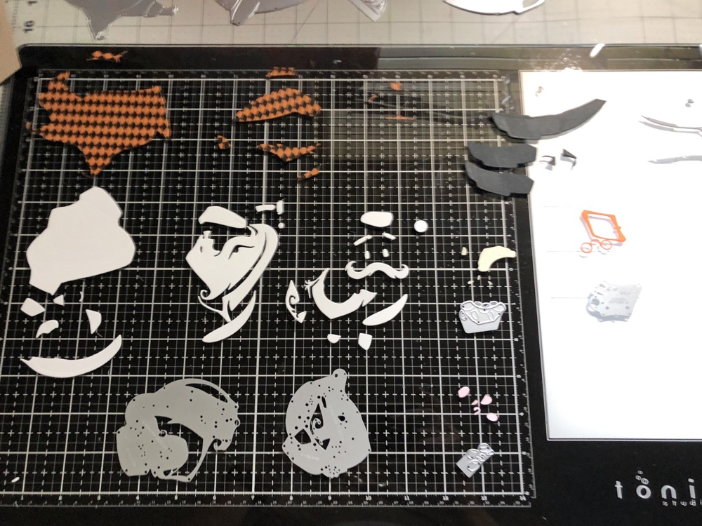 Keep it simple, lay out your Tim Holtz Halloween Kraft-stock and Jolly St. Nick Thinlits first. Then start cutting them out and also it important to keep each piece together.