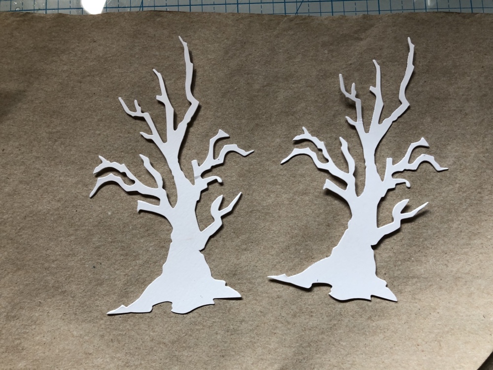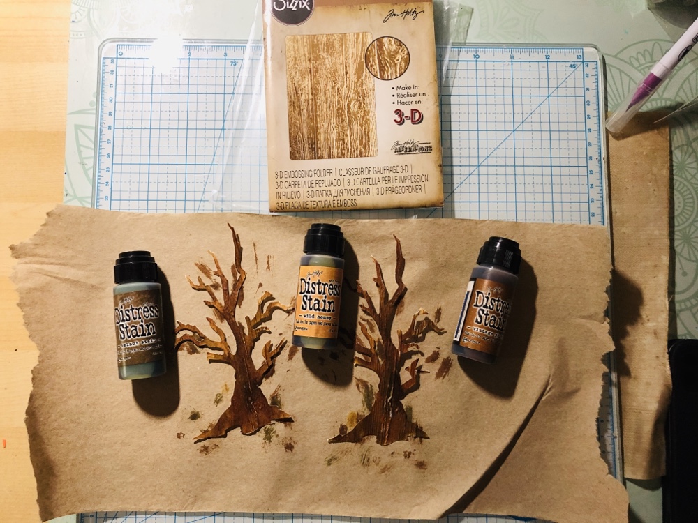 Next I used Tim Holtz watercolor paper and TH alterations big die call (branch tree). Then took distress stain ( vintage photo, walnut stain and wild honey) painted the trees. Let dry before using TH 3-D texture fade (lumber) #662718. Plus as you can see I cut out two tress because I wanted the tree to have dimensions to it.