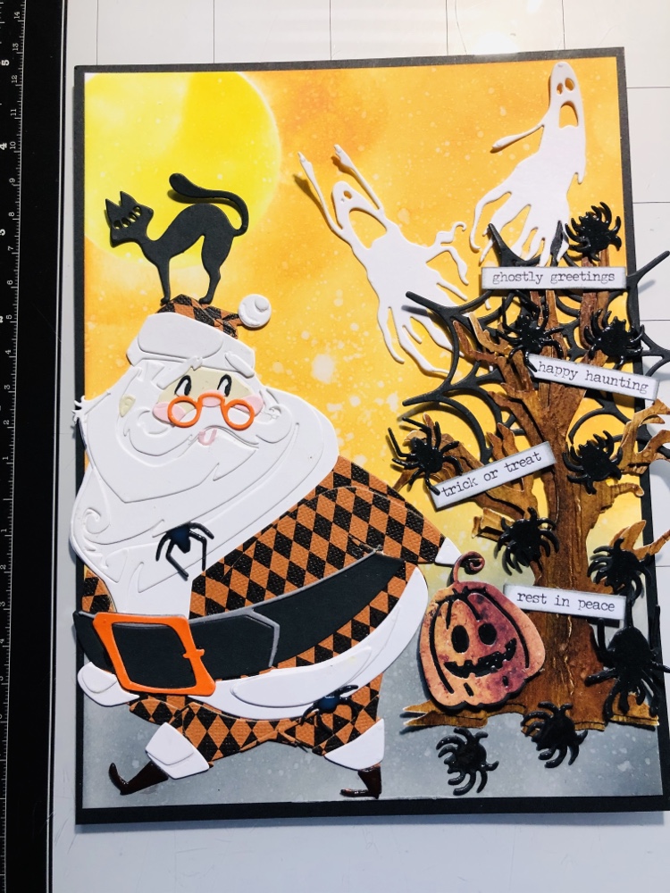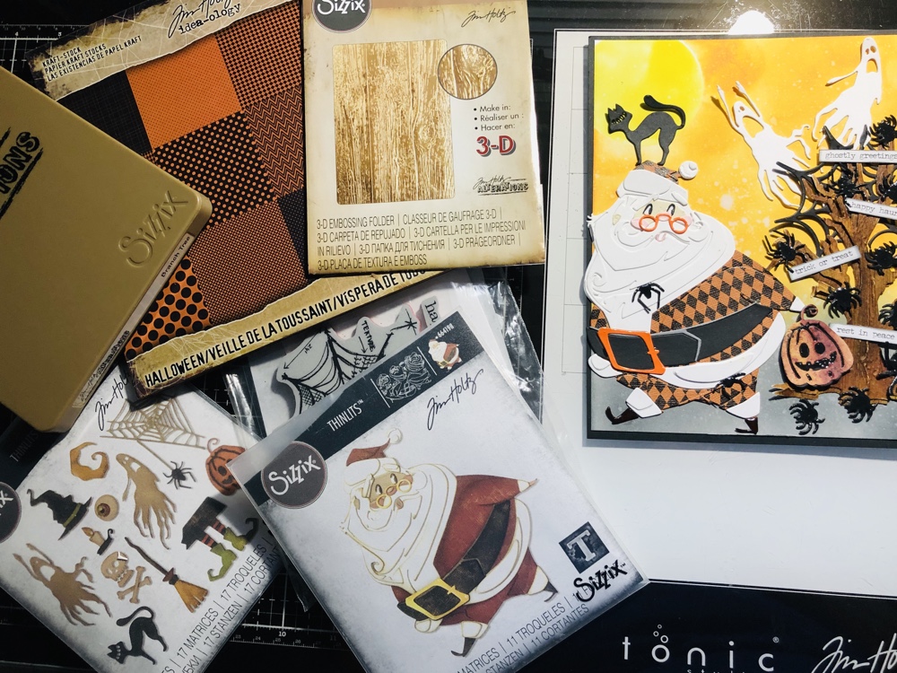 Hello my crafty friends! Yesterday I made this cute Halloween card with Tim Holtz products. Last year Tim Holtz came out with the Jolly St. Nick thinlits. And I fell in love with it. So last year I made a Halloween card with it. It posted of Oct. 2019 if you want to check it out. I told myself that each year I was going to make another one using Jolly St. Nick. So I did yesterday and it came out cute. I’ll list everything for you guys down below. Hope you like and if you do please let me know.