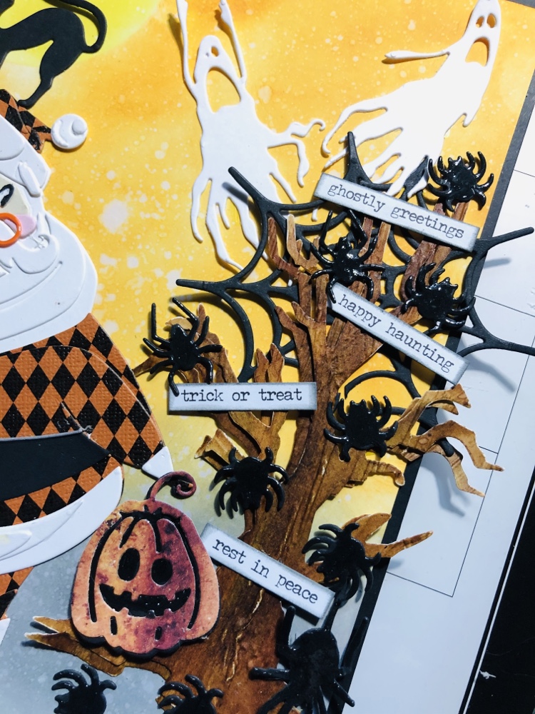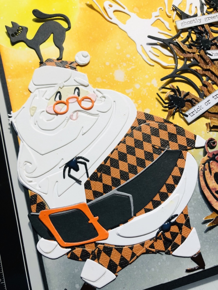 Next working on my background I took Tim Holtz watercolor paper and distress oxides ( hickory smoke, black soot, carved pumpkin, mustard seed and squeezed lemonade). Blended the colors together. Also die cut a circle to use for the moon. Took a water brush and splatters water over the water color paper and took a paper towel and tap dry. Cut out my spiders, ghost, cat and pumpkin using Tim Holtz Frightful Things Thinlits #664209. Used ranger glossy accents over the spiders, pumpkin and jolly St. nick eye glass piece and belt buckle. Took Tim Holtz small talk stickers occasions and distress oxide black soot to give it a little shade. The web came from an old set of Tim hotlz stamp and die I had. Sorry don’t know the name or number. But you can used his new out there.