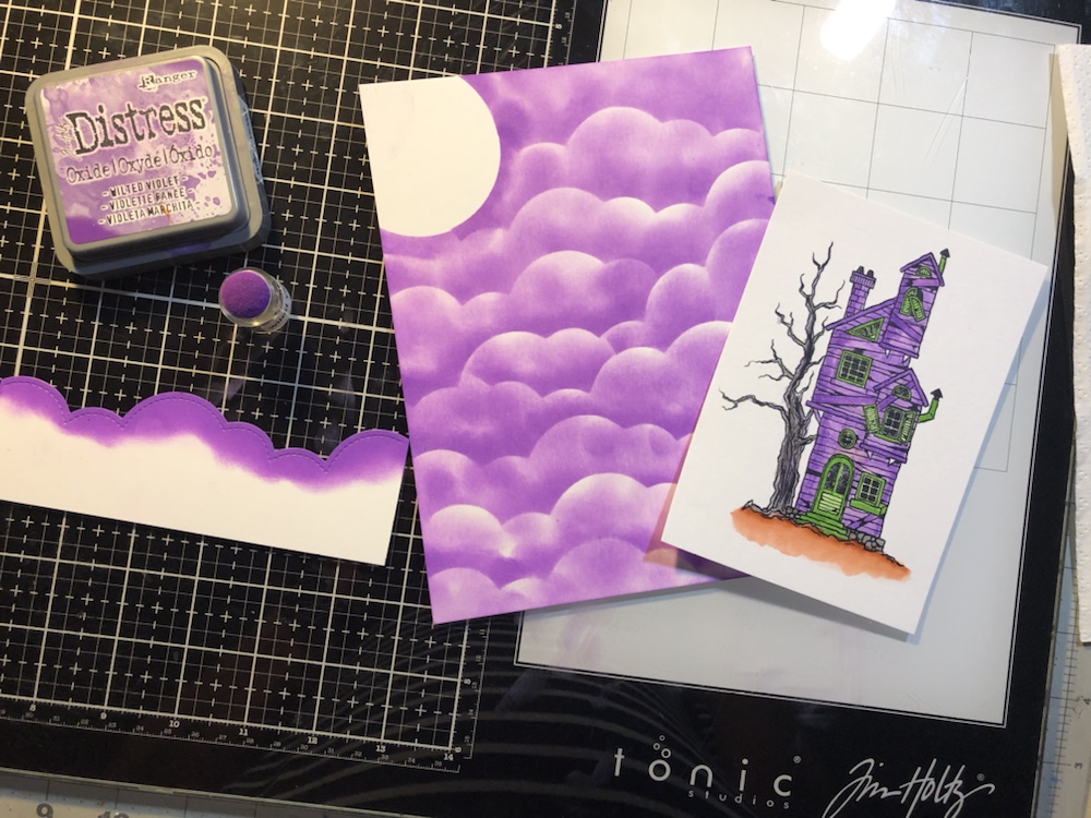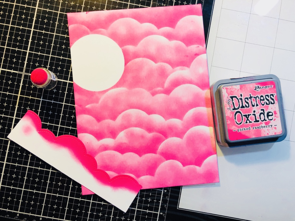 To make the background I took Sizzix Clouds stitched die and 110 white card stock and cut out and used like a stencil for my background with Tim Holtz distress oxide picked raspberry.
