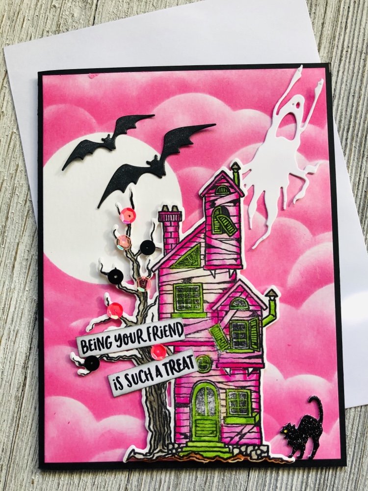 Remaining products I used are strathmore mixed media vellum surface 184 lb., 110 black and white card stock. I also use a clear glitter pen on the house and bats to give it a shimmer look. Sequins are pink, purple and black.