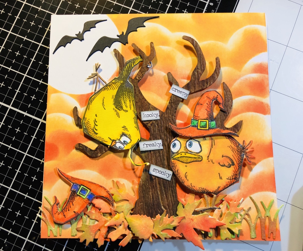 Other products used are Tim Holtz Fall Foliage #660955, Bat Crazy #664203. Bird Crazy stamp cm237 and Bird crazy thinlits #660954, Crazy Things Stamp cms237 and Framelits #660953. TH small talk occasions too.