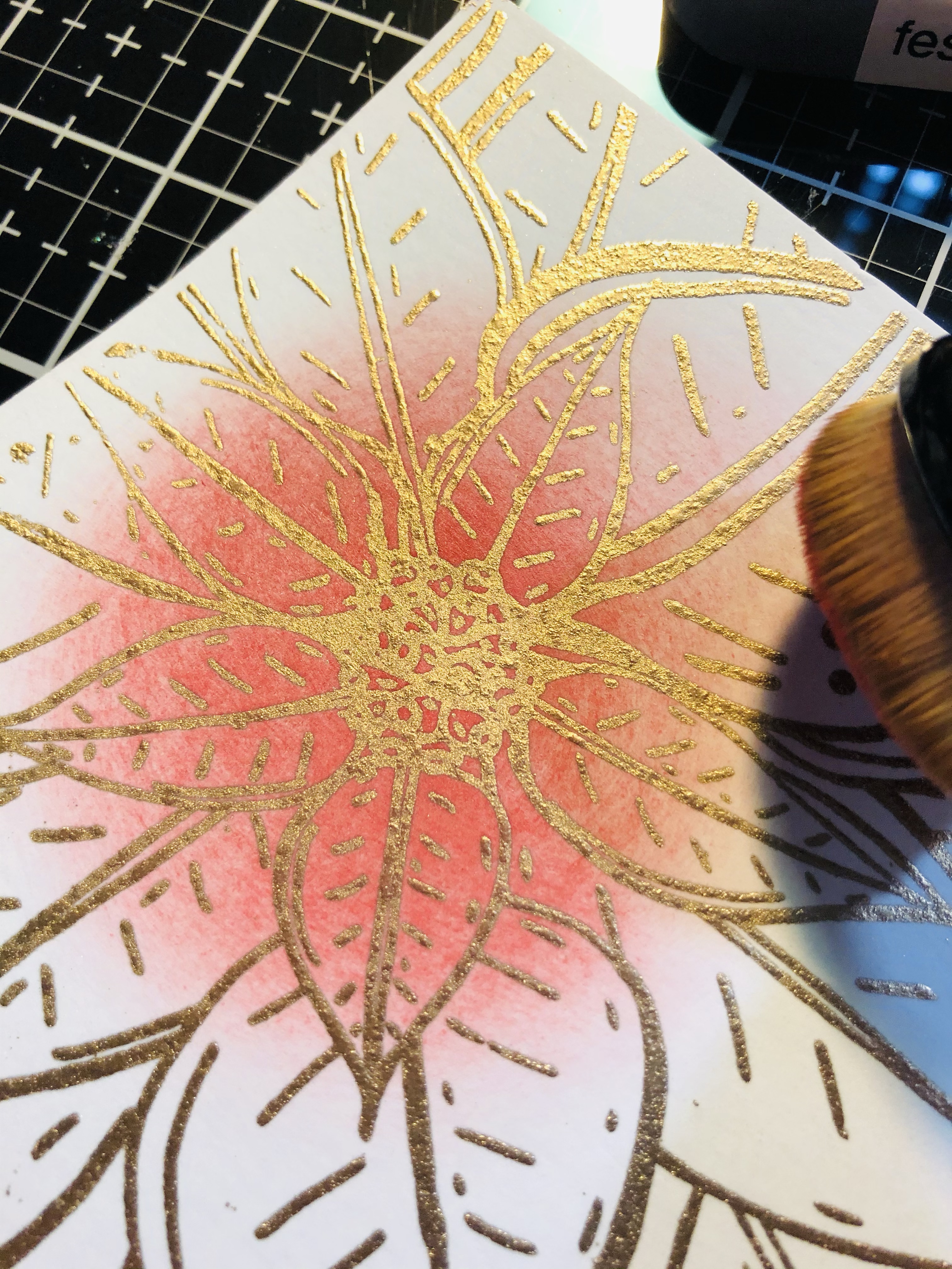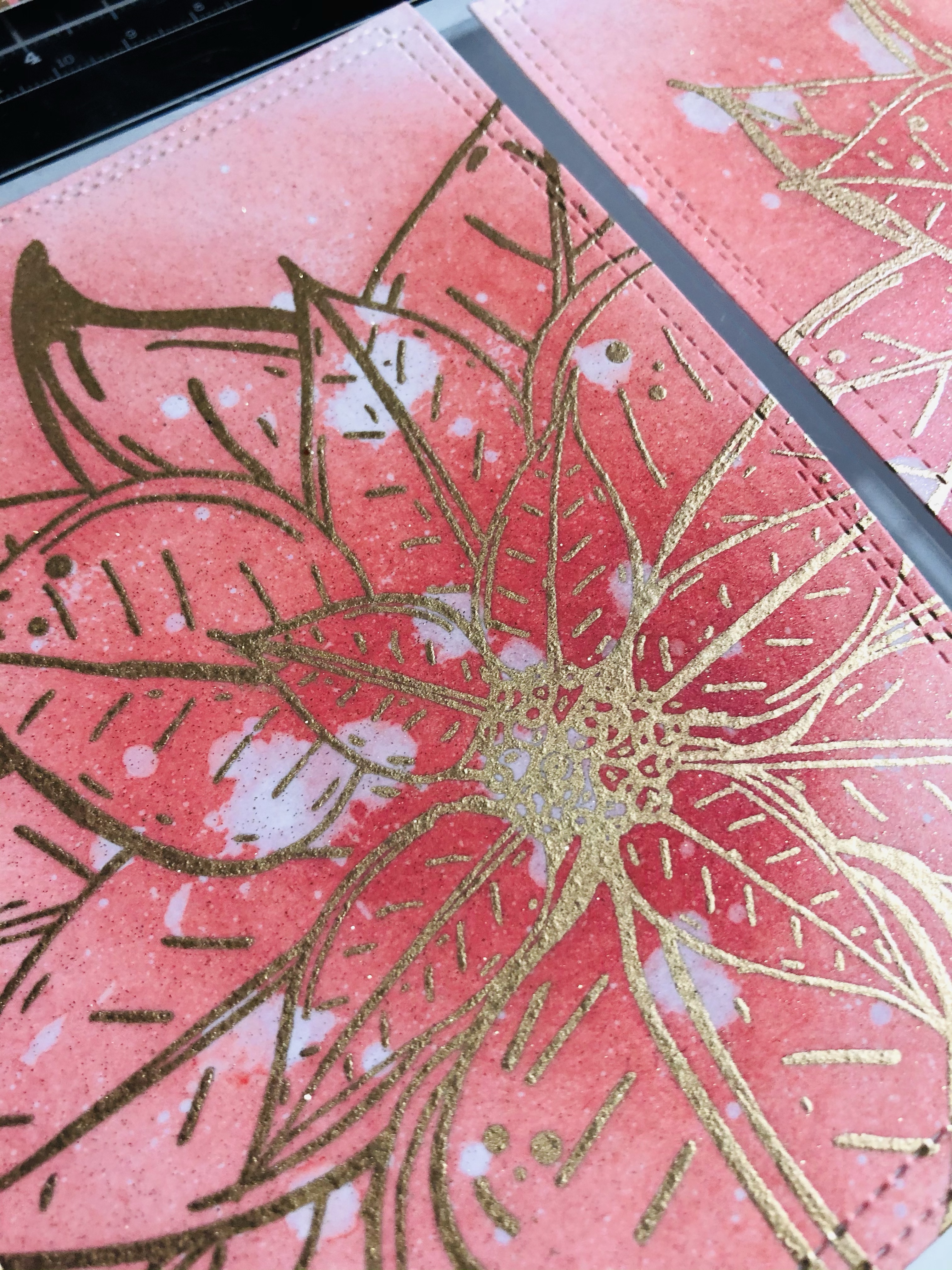 I also took distress oxides barn door and candy apple and blended the colors in on the poinsettia. I took some water drops and tripped it onto the poinsettia and then tap dry with a paper towel. The poinsettia stamp I use is by picket fence studio.