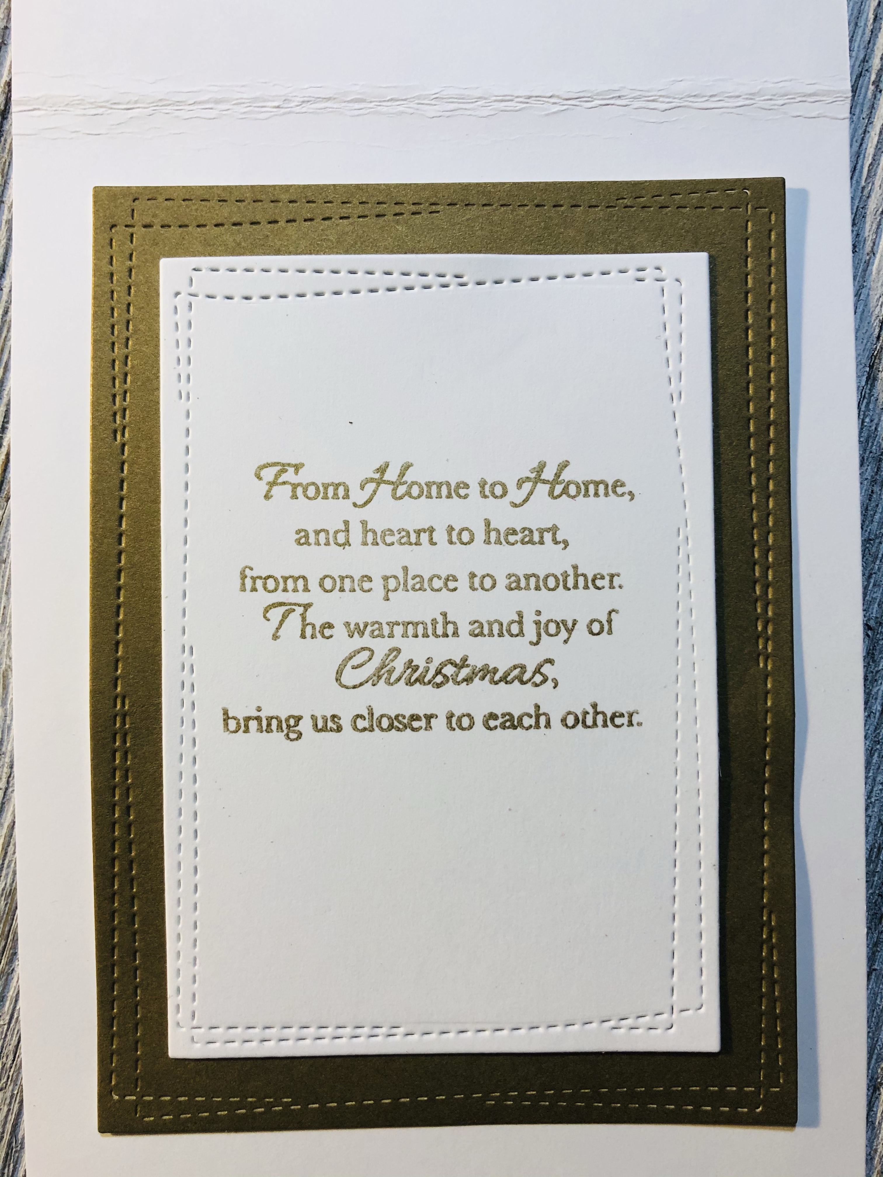 I used Simon Says Stamp die joyful and cut it out with beige and red shimmer paper. The inside of the card is stamped with Recollections stamp set called Christmas verses and Encore gold metallic ink.