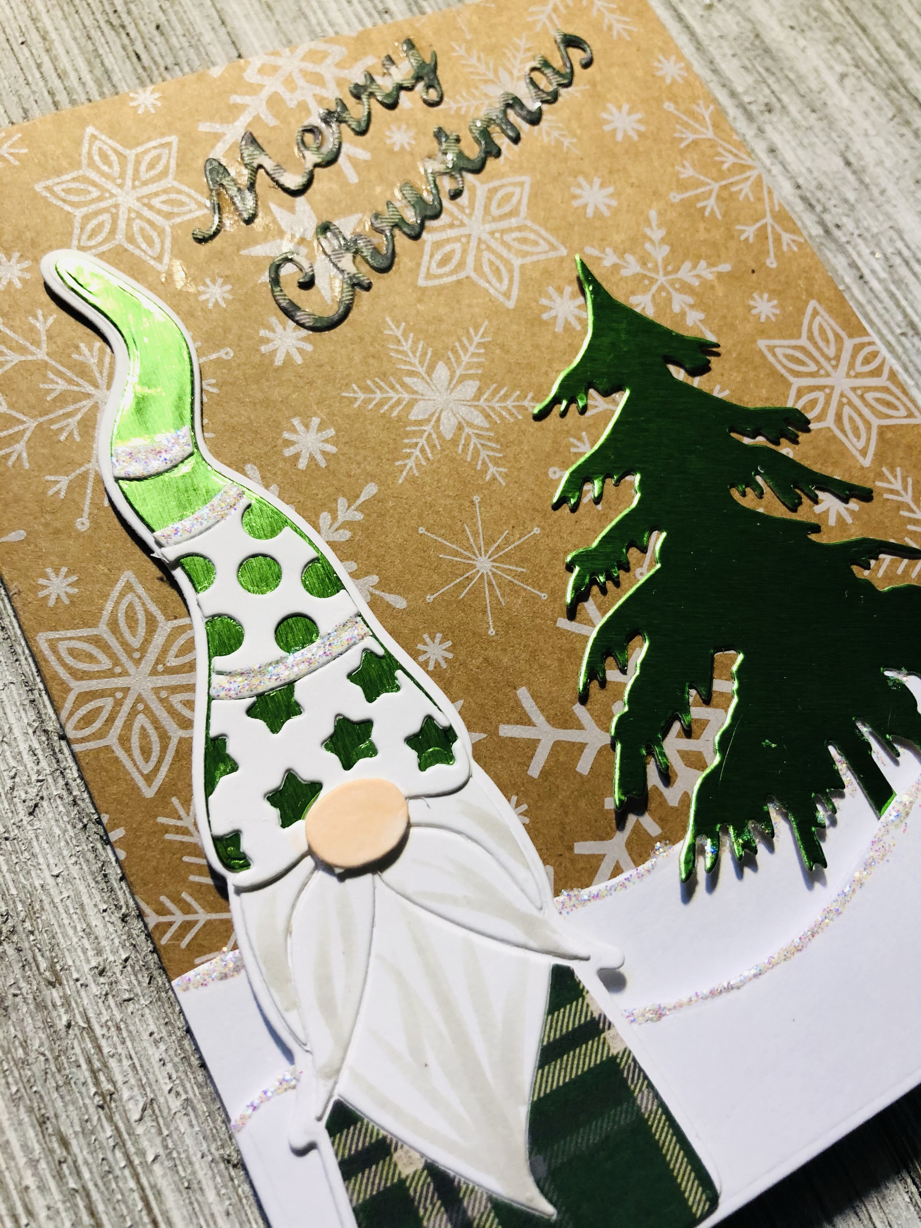 I also used Impression Obsession Christmas tree dies with TH metallic Kraft stock. To make the snow I used TH Home From The Holiday dies. On 110 cards stock and ranger star dust sticklers. I really had so much fun putting together these Deco Hat Gnome dies.