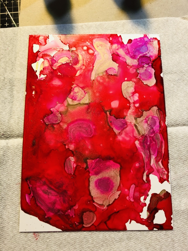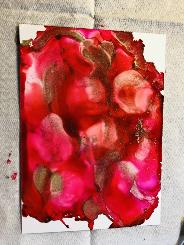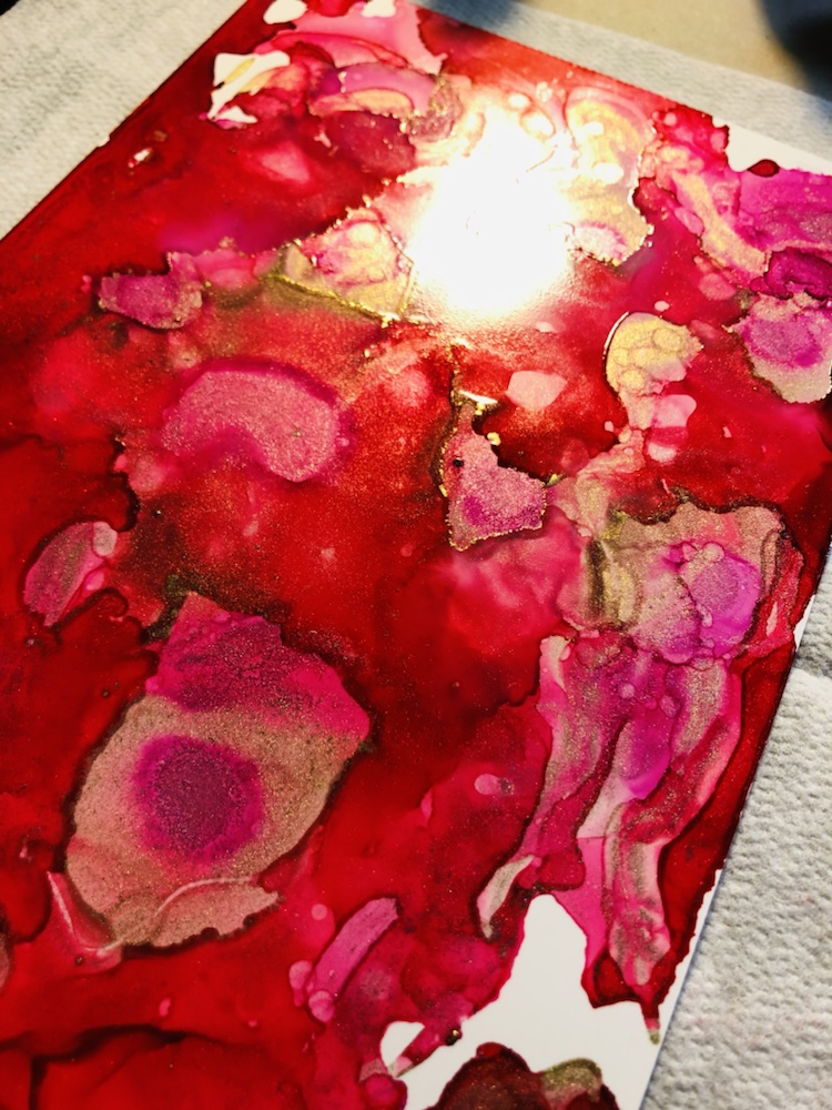 Tim Holtz Alcohol inks are watermelon, gumball and pearl intrigue. I also used Pinata alcohol ink rich gold and blanco. Tim Holtz blending solution and yupo paper.