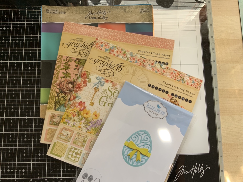 I used graphic 45 double-side paper called Secret Garden Collection, Tim Holtz idea-ology kraft- stock Metallicd Jewels. And Elizabeth craft designs 1627 Elegant Easter Eggs die.