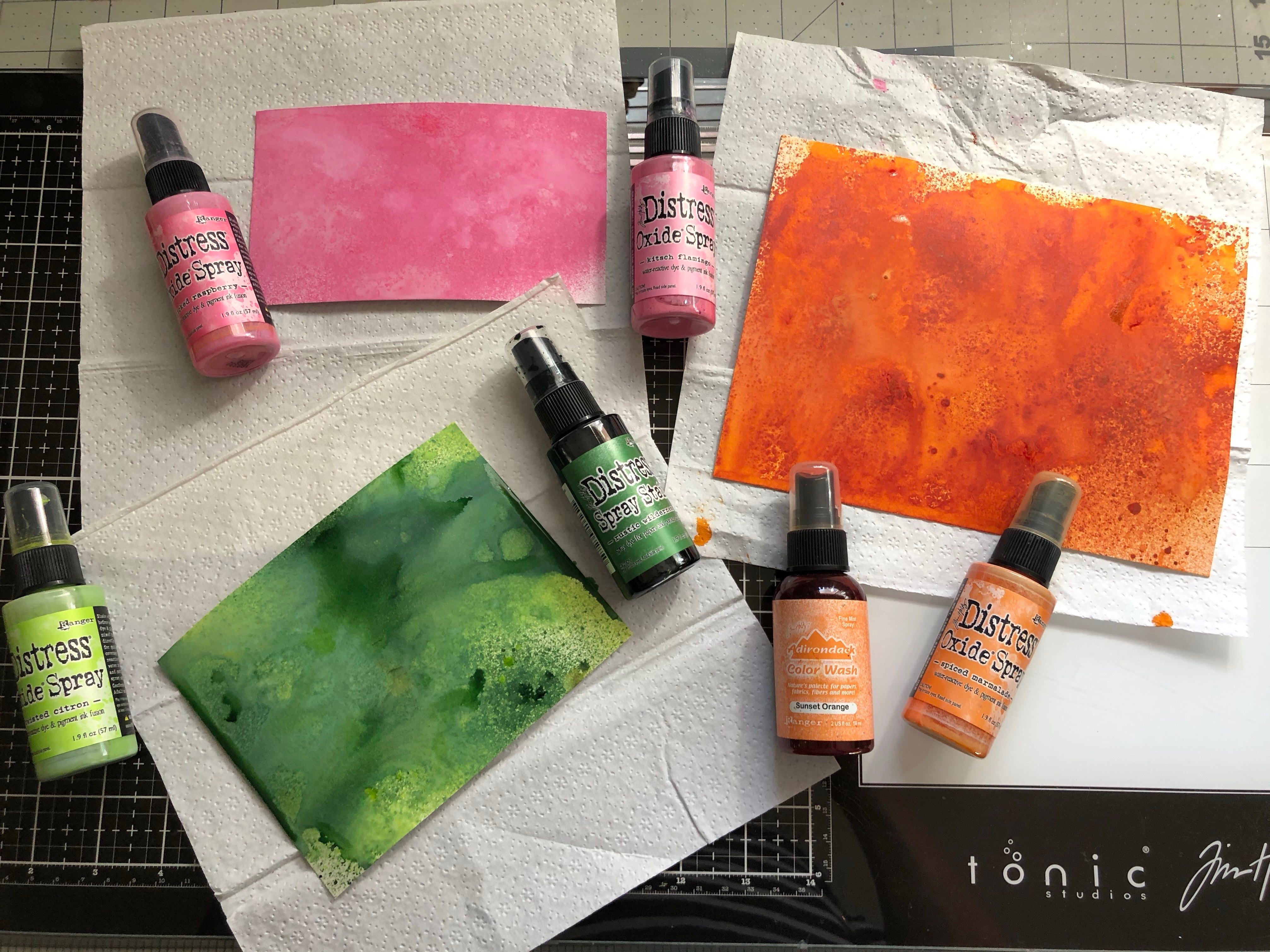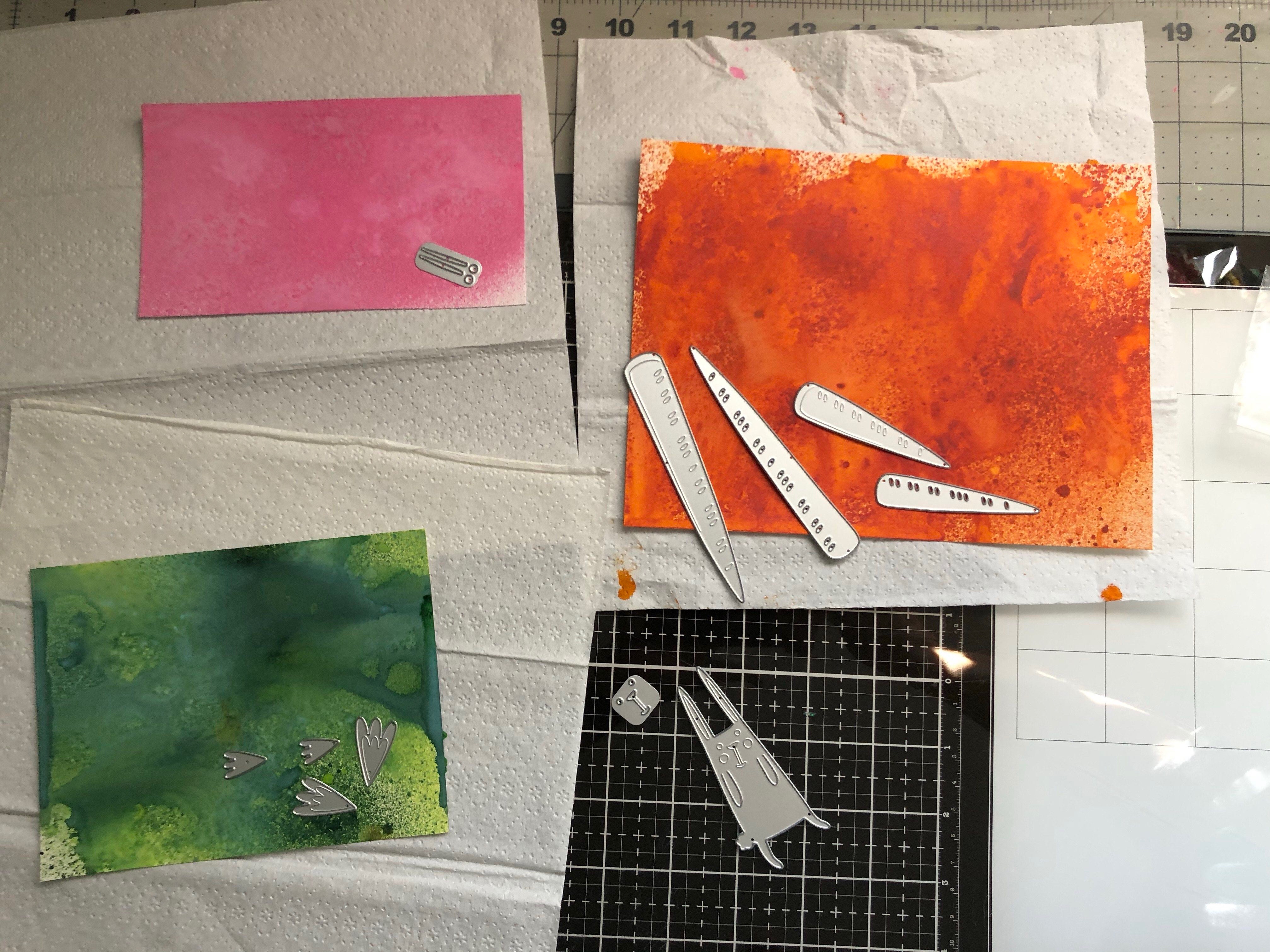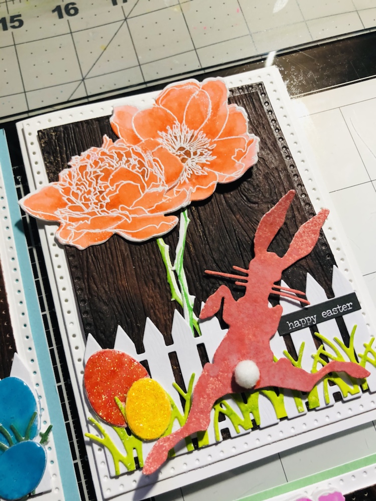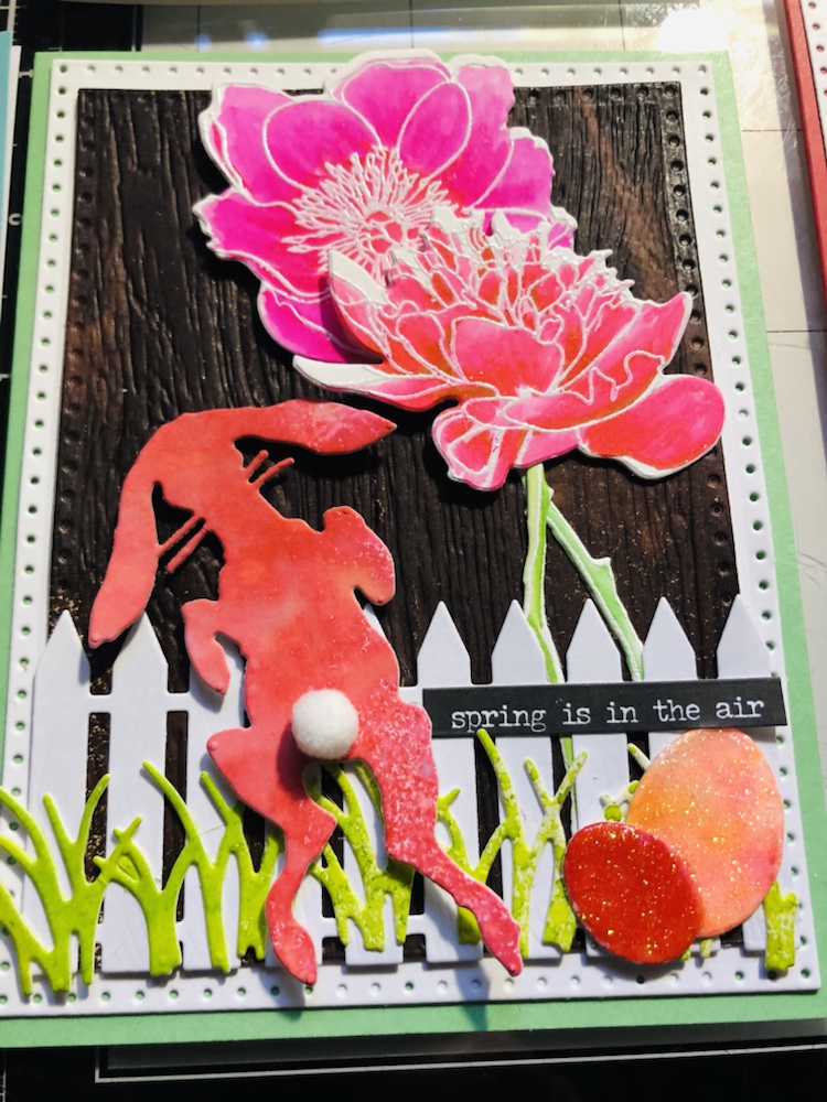 I used to Tim holtz distress spray stain rustic wildernesses, distress oxide spray twisted citron for the top of the carrots. On the bunny ears I use distress oxide sprays kitsch flamingo and picked raspberry. Carrots colors are T.H Adirondack color wash sunset orange and distress oxide spiced marmalade. Dirt I used distress stain antique linen, wild honey and vintage photo. The sky is distress Oxide broken china. Fence is cut out of 110 cardstock, impression obsession die and used Tim Holtz 3-D texture fades lumber # 662718. This is adorable set!
