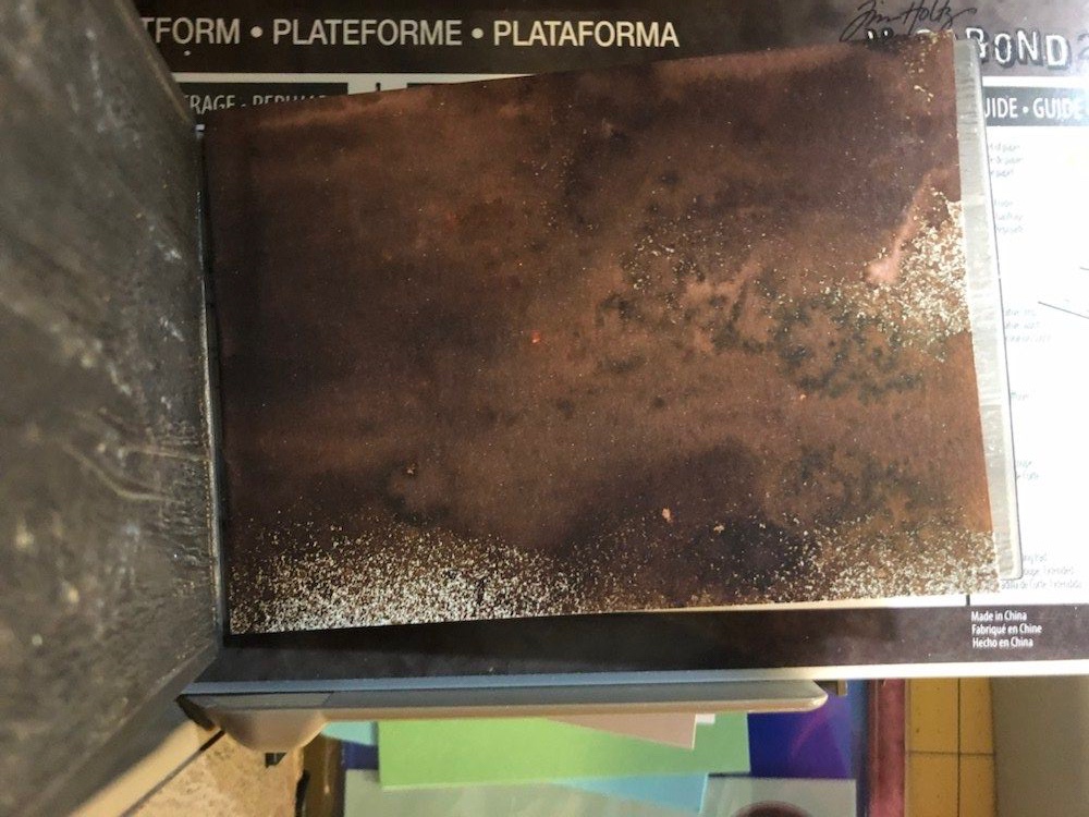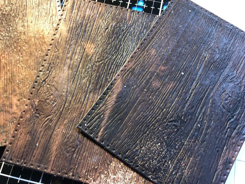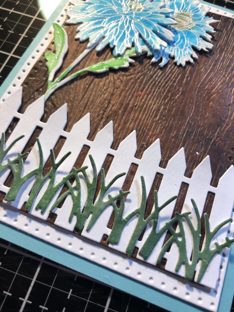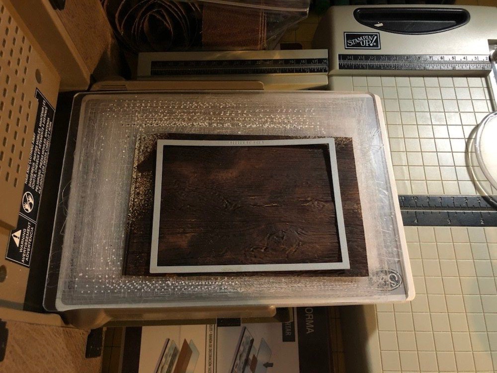 I used Distress spray stain ground espresso and Dylusions ink spray melted chocolate. I pick Tim Holtz 3-D texture fade Lumber #662718, run it threw my T.H. Vagabond 2, three time. Then took My Favorite Things frame die and also run it threw my machine. Gave my back ground a wonderful real look of wood.