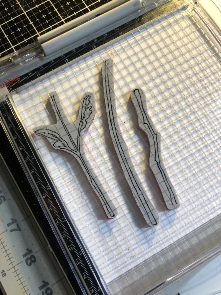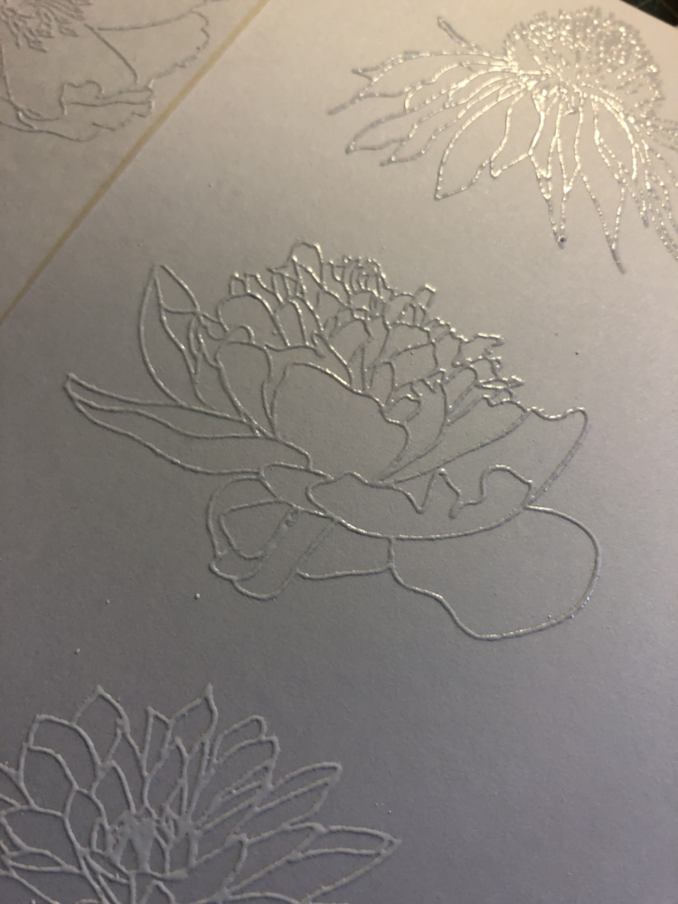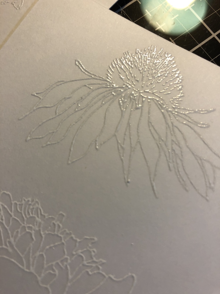 Here I used Tim Holtz stamper anonymous flower garden set CMS215, T.H. Platform, distress embossing ink, ranger embossing powder white and stamp it on Strathmore mixed media paper vellum surface. Then used my heat gun to dry it. Gave it a beautiful glossy look.