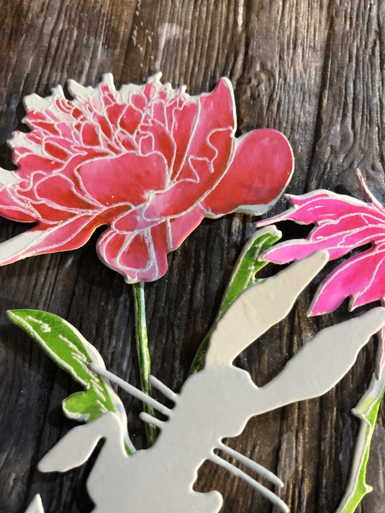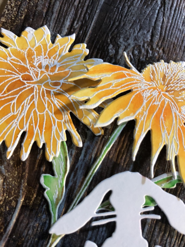 List of colors I used for all flower are Zig water color pens 031 cobalt blue, 036 light blue, 042 turquoise green, 041 light green, 047 may green, 067 mustard, 052 bright yellow, 050 yellow, 061 light brown, 023 scarlet red, 070 orange, 021 light carmine. 022 carmine red and 025 pink. Took a water color brush and blend colors in each flowers. Cut flowers out with Tim Hotlz flowers garden & mini bouquet framelits #661613.