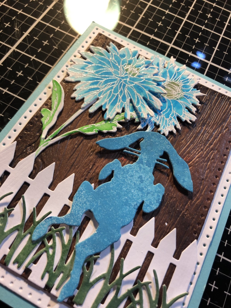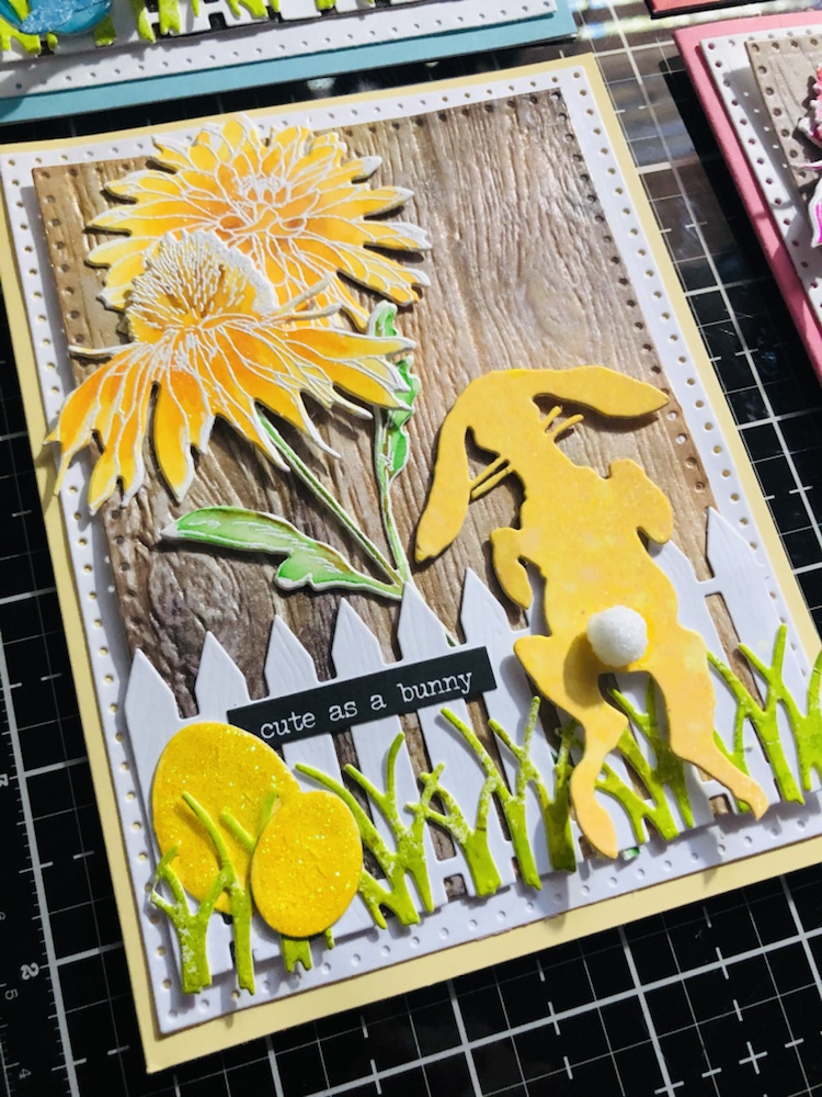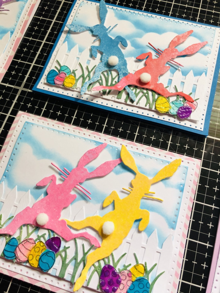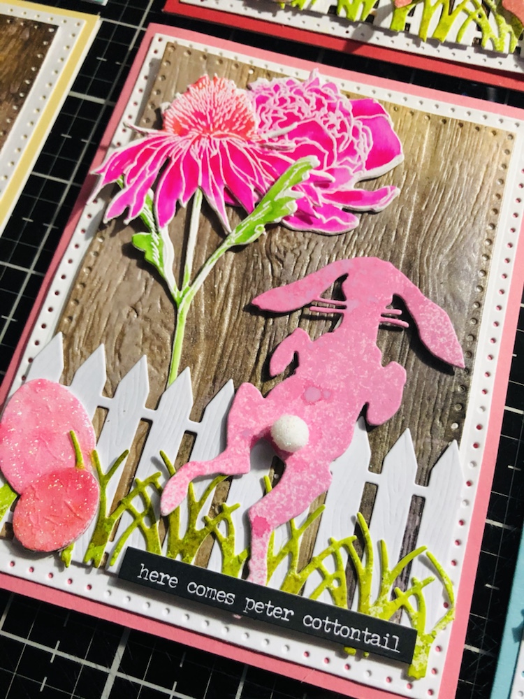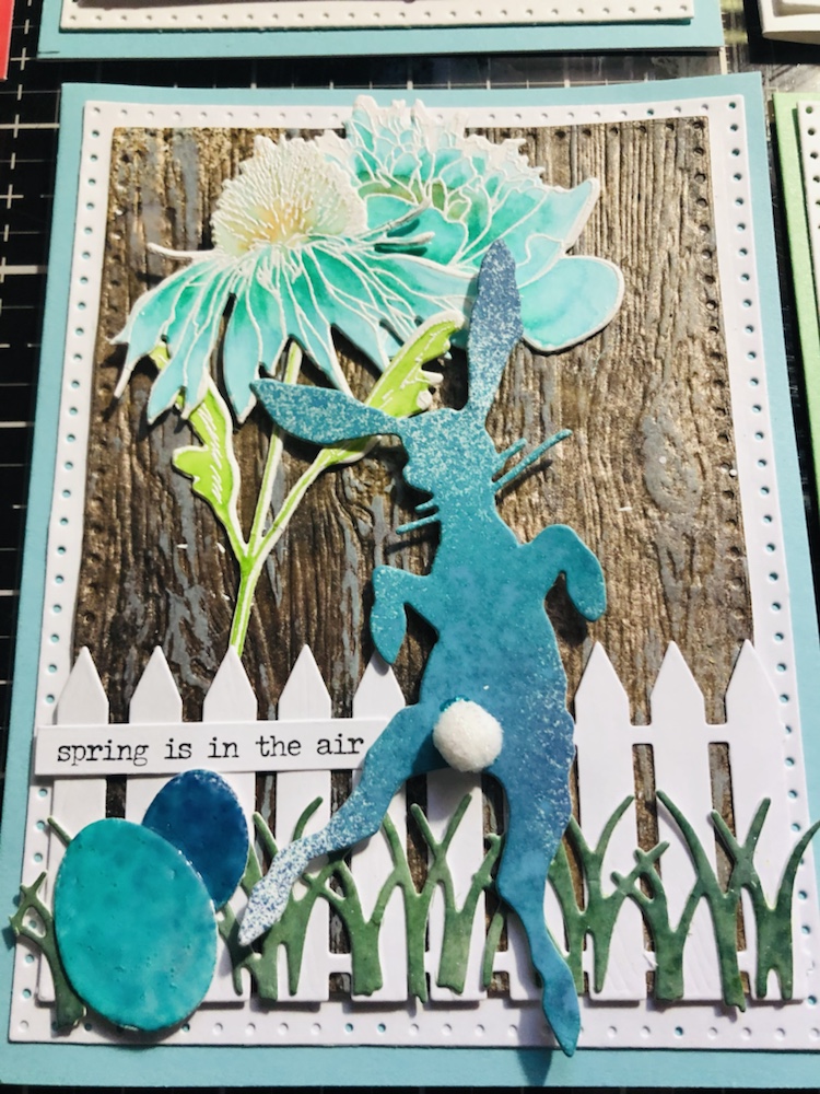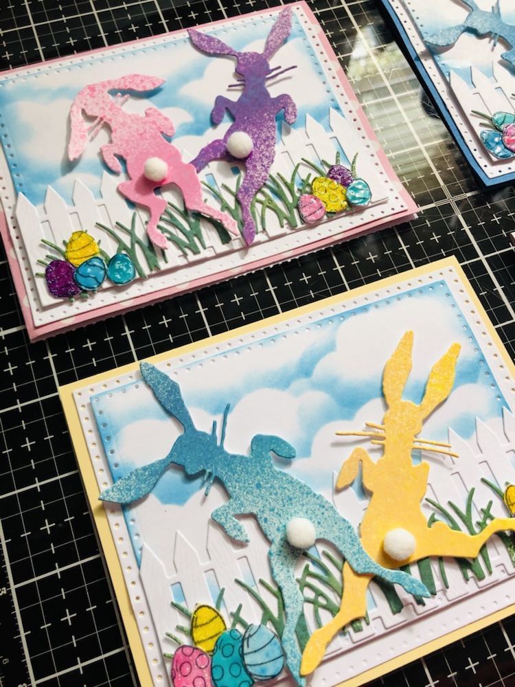 My handmade Easter Cards for my wonderful grand & great grandchildren’s. Plus I made other little goodies to go out in the mail with theses cards. The colors I used for theses bunny’s are Tim Holtz distress oxides sprays kitsch flamingo, dusty concord, squeezed lemonade for the bunny’s. For the sky mermaid lagoon and for the grass rustic-wilderness. Bunny’s here are T.H. Distress oxides sprays crackling campfire, mermaid lagoon. The fence is Impression obsessing dies die206-V cut with 110 white cards stock.