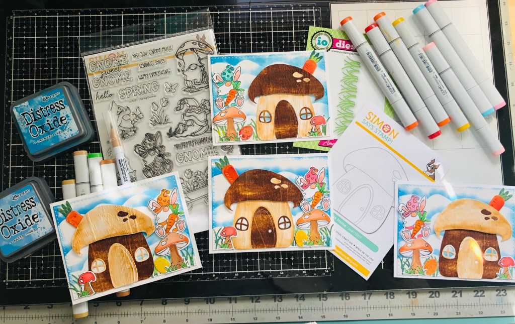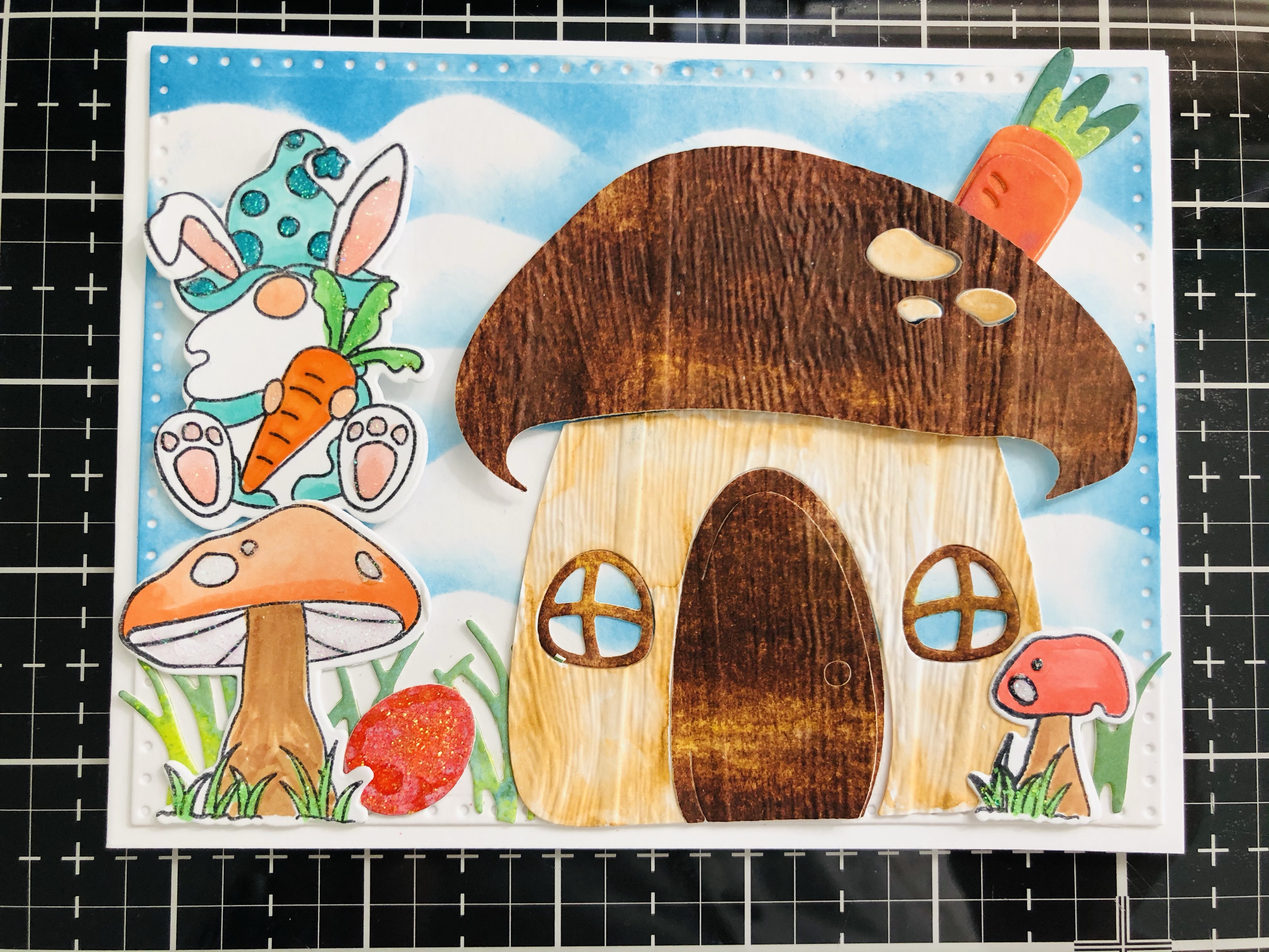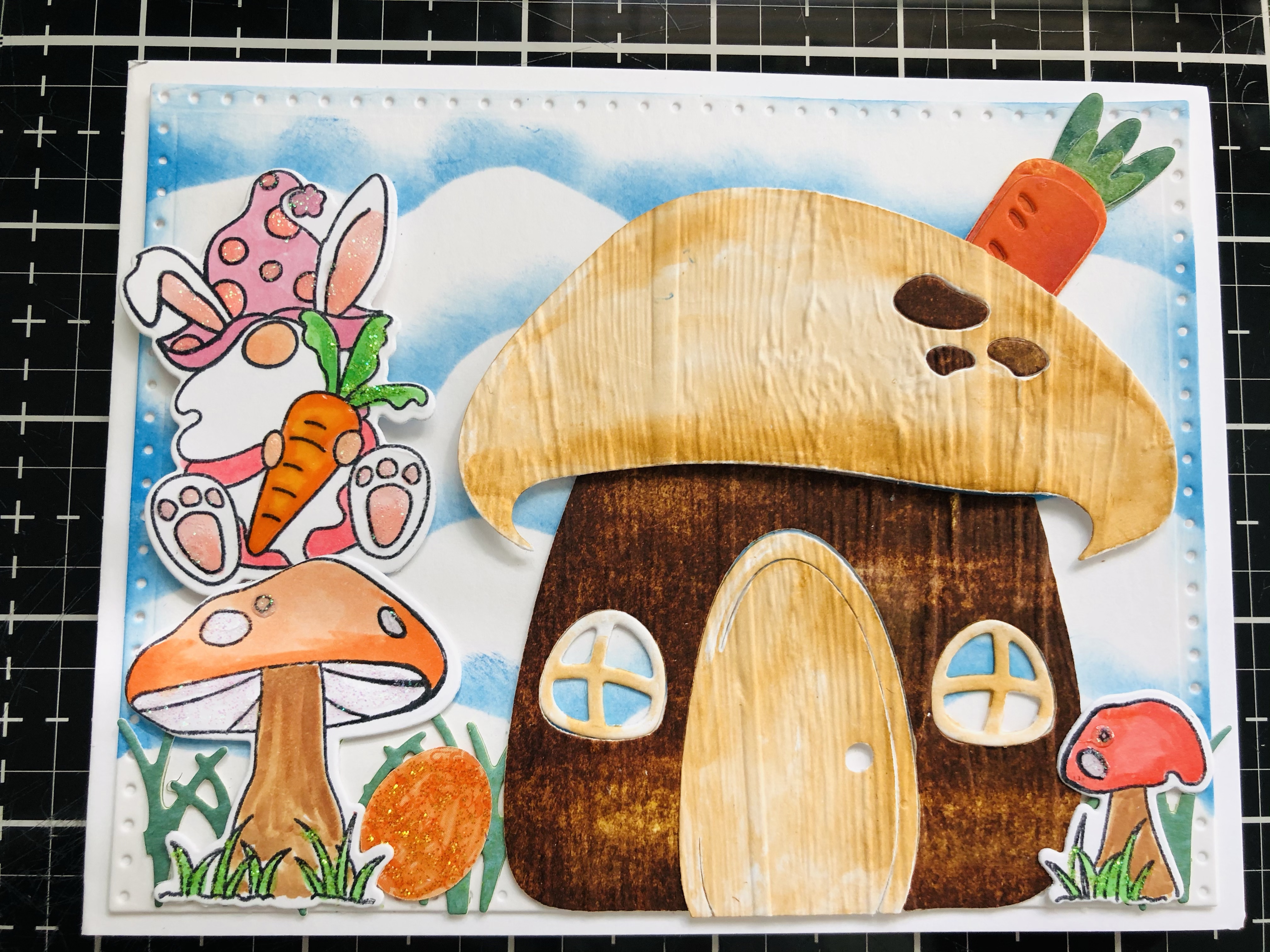 Happy Easter Gnomes Cards Background I used Tim Holtz distress oxides pads salty ocean and mermaid lagoon for the sky. And TH carrot bunny for the chimney on top of the roof. Impression obsession grass die.