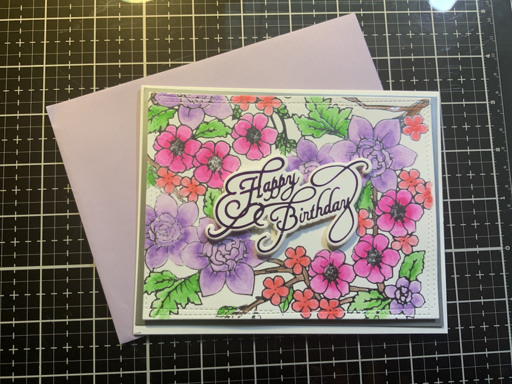 I did the flower pattern in silver foil and used my spellbinder Glimmer machine. Also used my Zig watercolor pens and water brush to blend the colors together. Zig pens are No. 025 pink, No, 083 Lilac, No. 047 may green , No. 065 mid brown and Light carmine. Spellbinder Glimmer foil is fuchsia flower and elegant occasion sentiments happy birthday.