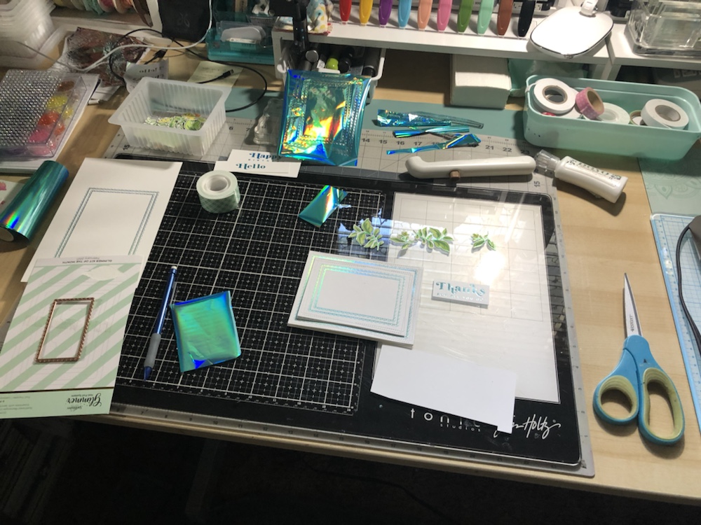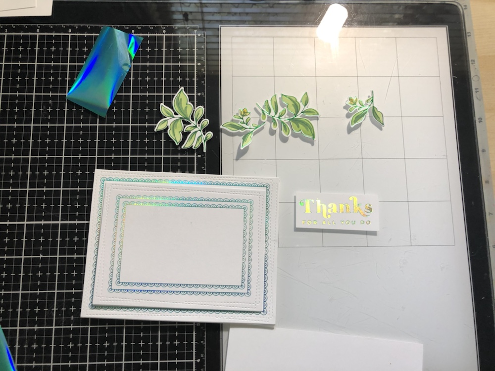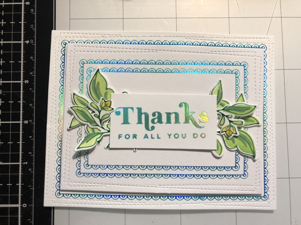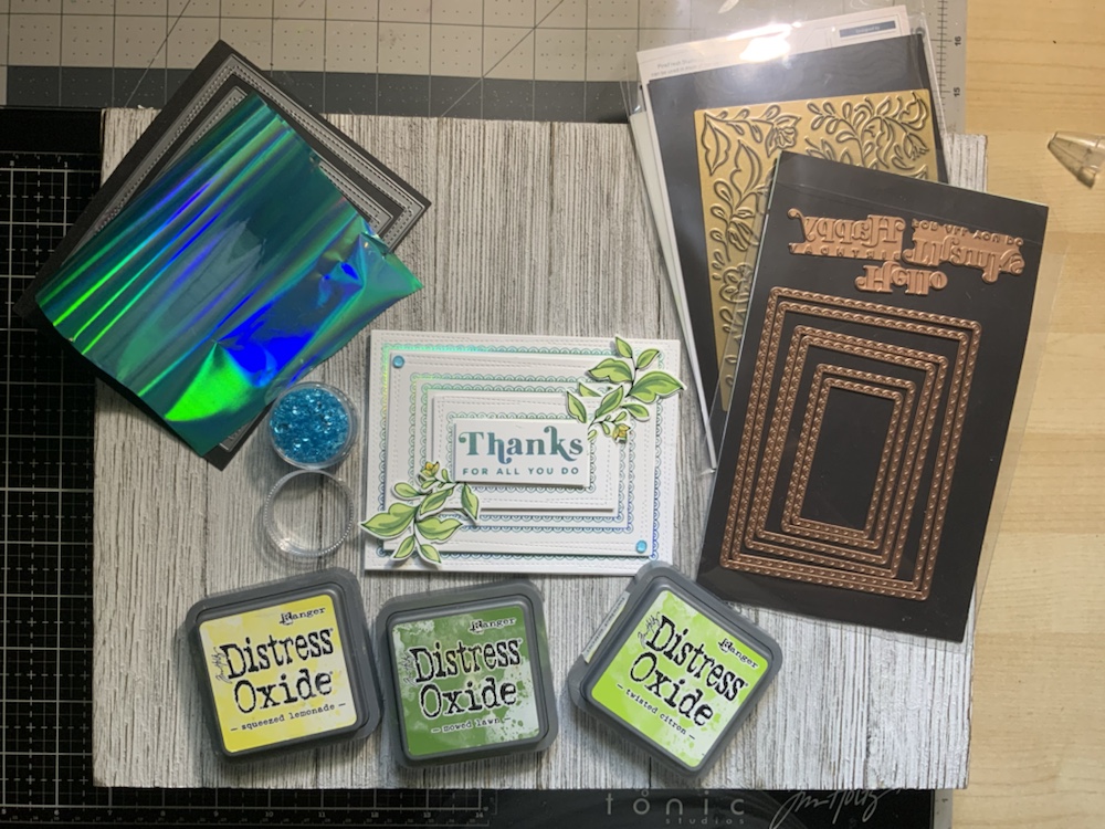 Hello my crafty friends! I have been working with spellbinder glimmer foil and Tim Holtz distress oxides colors. I wanted to keep it simple but yet pretty. So this is what I came up with.