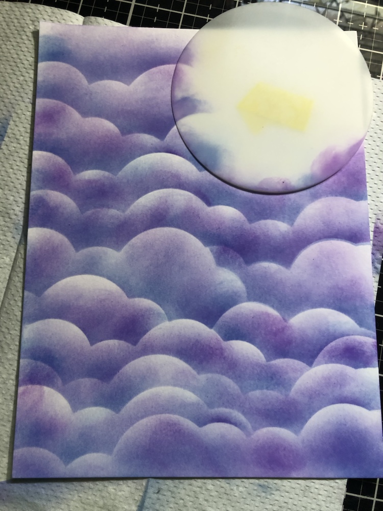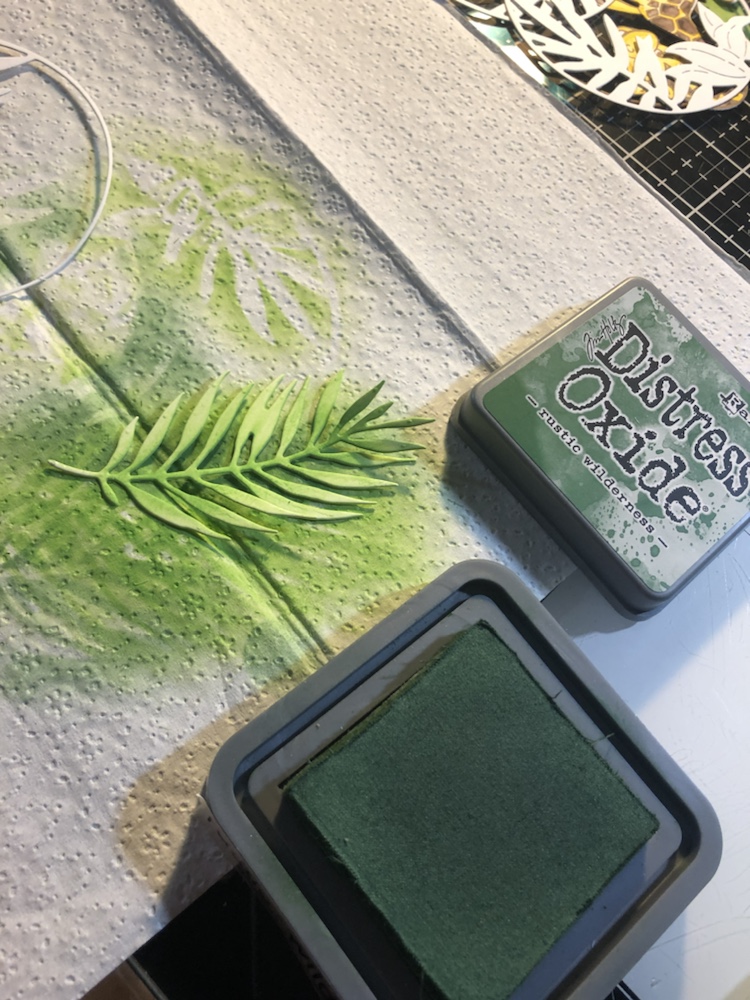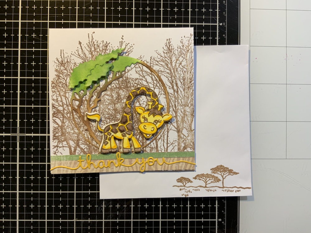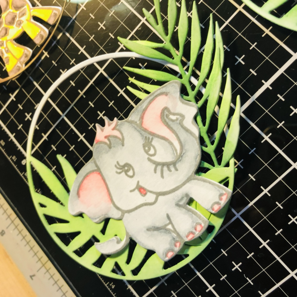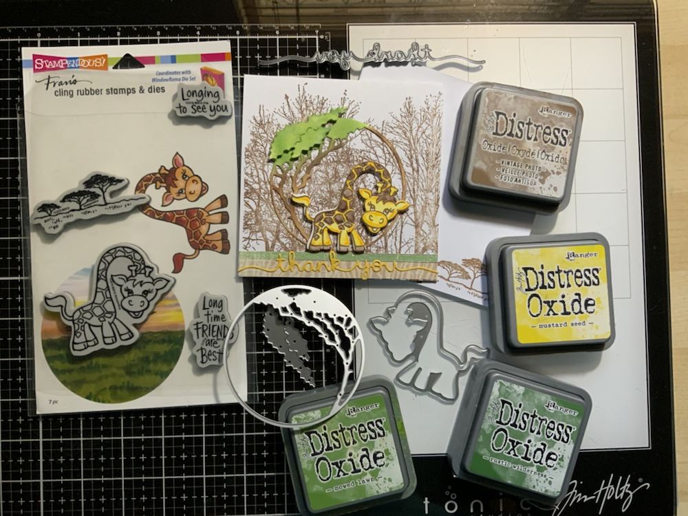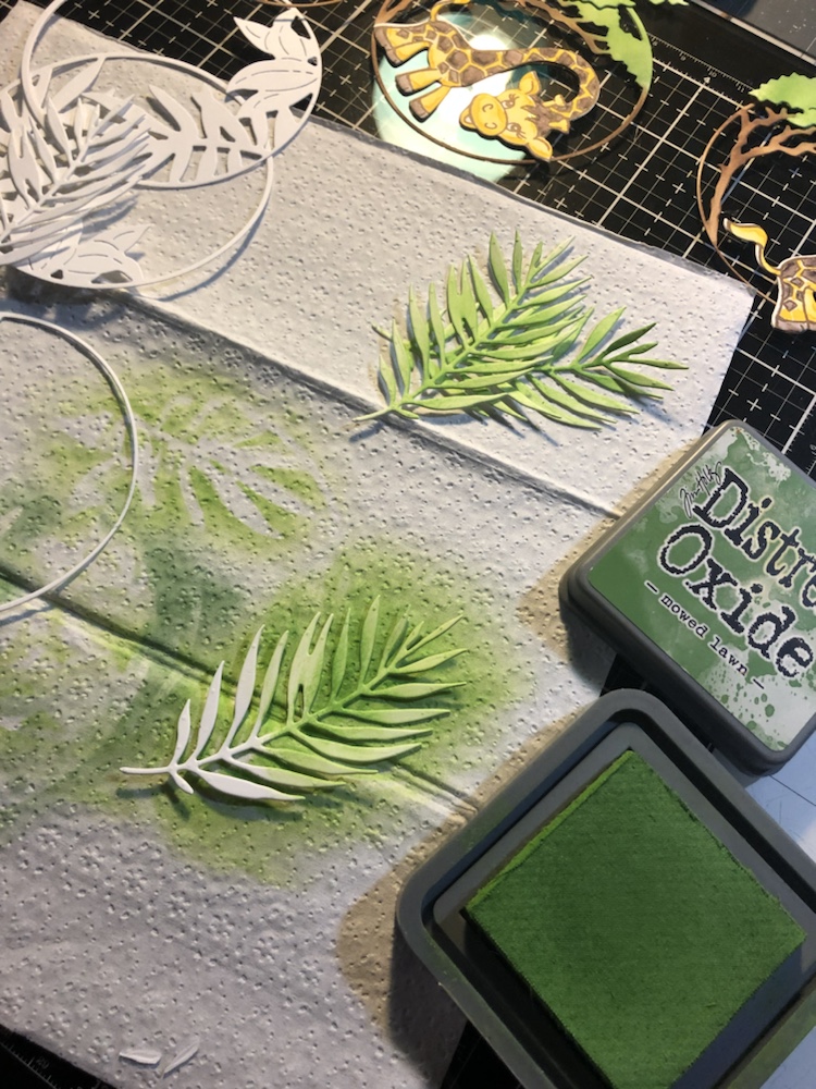 Here I used Stampendous! Giraffe stamp & die set. Cut them out using 110 wt. white card stock. Took Tim Holtz distress oxides rustic wilderness, mowed lawn and vintage photo on the circle background. The Giraffe color are mustard seed and vintage photo.